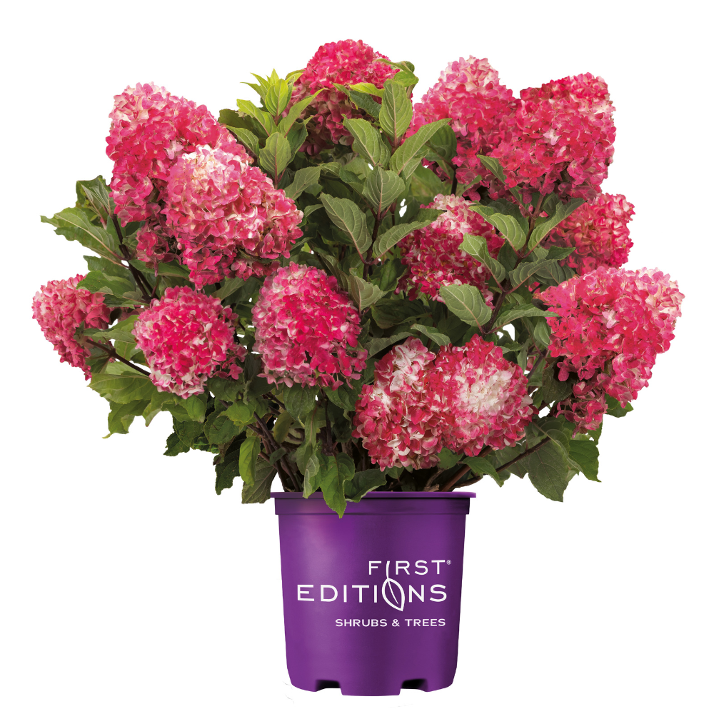 Hydrangea p. Spring Sizzle® shrub with vibrant pink and white bloom clusters, deciduous shrub with lush green foliage.