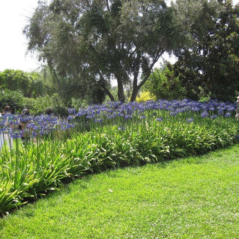 Agapanthus Storm Cloud is a compact long-blooming perennial with green strap-like foliage that develops a red tint in fall. Loose global clusters of large deep violet-blue tubular flowers that bloom on tall stalks above the leaves throughout summer. Agapanthus Storm Cloud flowers best when pot-bound and consistently moist. Agapanthus Storm Cloud is disease and pest resistant, and drought tolerant once established.
