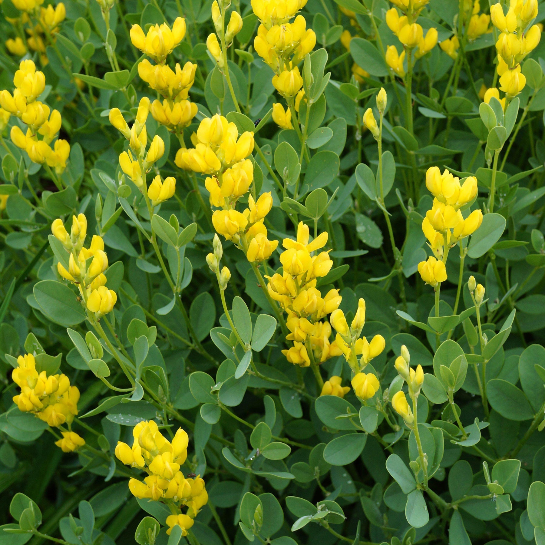 Baptisia American Goldfinch is a dense, upright perennial native plant with attractive blue-green foliage. From late spring into summer, it produces profuse golden-yellow blooms that cover the foot-long racemes rising above the foliage mound. After flowering, the blooms give way to large seedpods that turn black when ripe, adding ornamental interest even after bloom time.