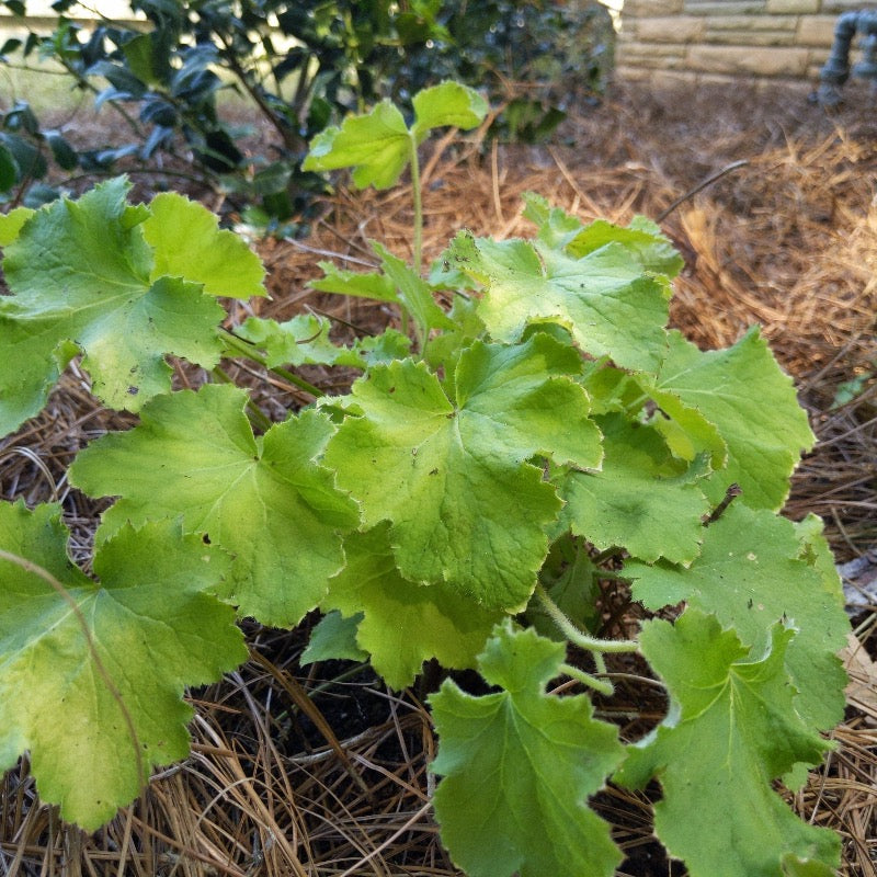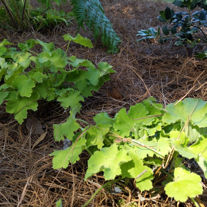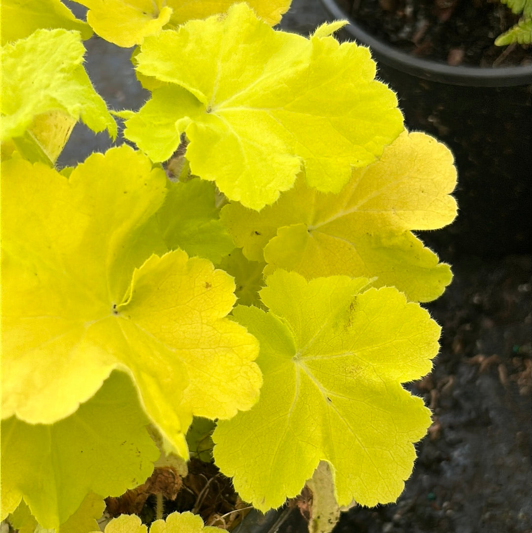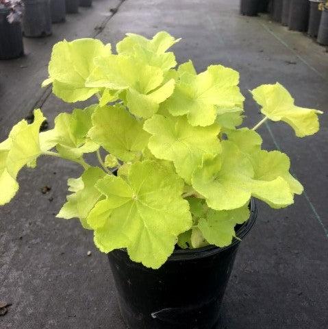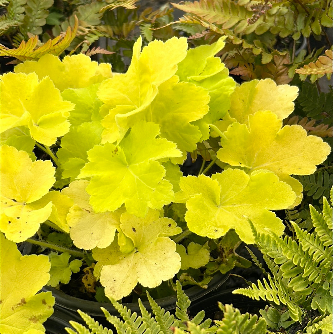 Citronelle Coral Bells is a native evergreen herbaceous perennial with a clumping habit. The rounded-lobe cordate leaves that create a basal mound are bright citron yellow with silver undersides. Tiny creamy white bell-like flowers on spires in midsummer attracting butterflies. Best bloom in partial sun and moist well-drained soils.