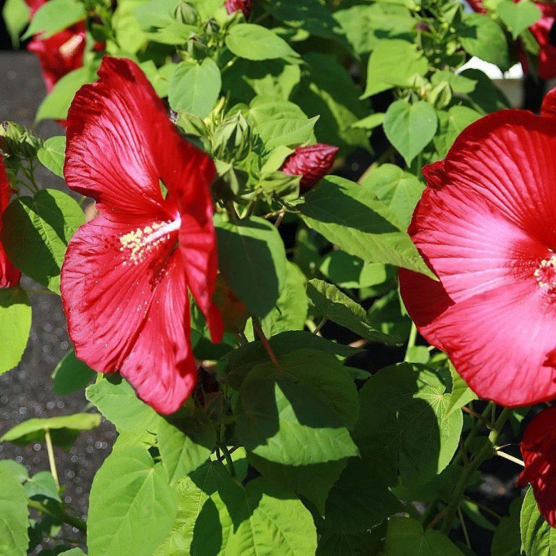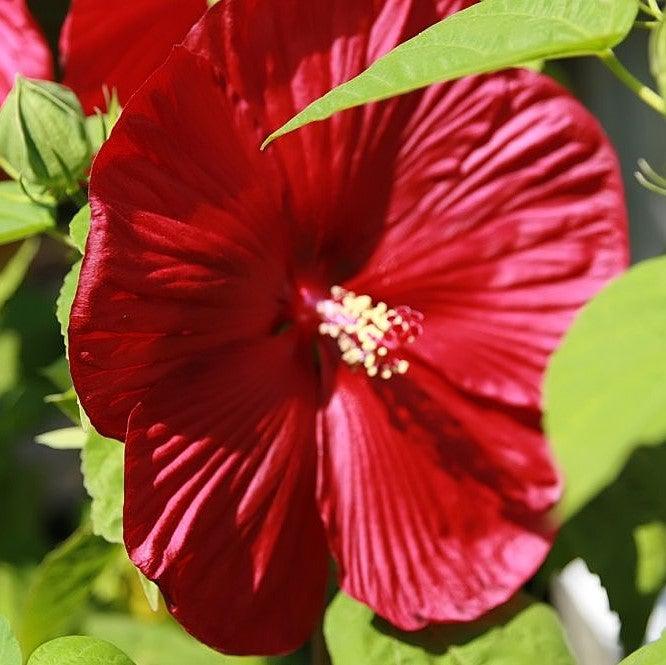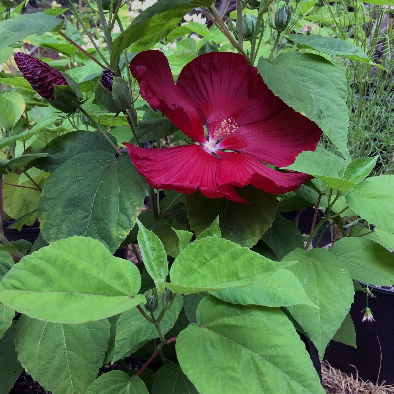 Luna Red Hibiscus is a dwarf woody perennial with upright hardy stems and large lance-like foliage with hairy undersides. The huge burgundy red flowers with creamy stamen bloom repeatedly on the upper leaf axils throughout summer until frost attracting butterflies. Best bloom in full sun and moist well-drained soils.