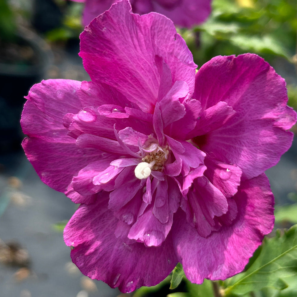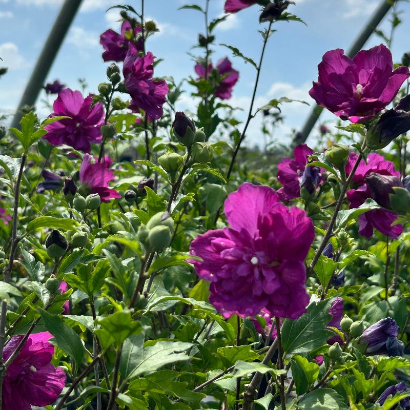 Raspberry Smoothie Rose of Sharon is a woody perennial with upright hardy stems and glossy vibrant green foliage.  Huge double crepe-paper like fuchsia pink flowers bloom from mid summer until the first frost attracting butterflies.  Best bloom in full sun and moist well-drained soils.