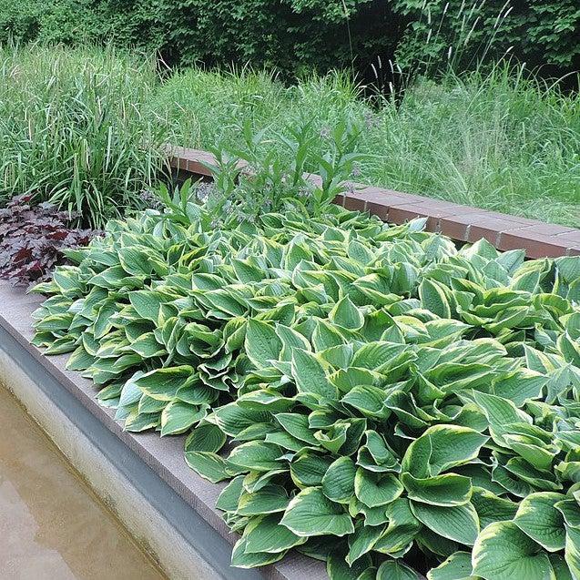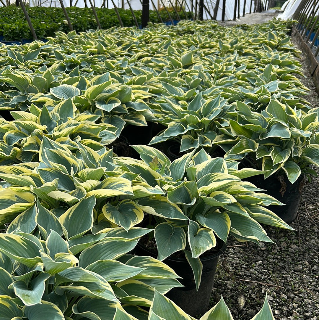 First Frost Hosta is a shade-loving herbaceous perennial primarily grown for their foliage. The large basal leaves are deeply veined blue-green with a wide creamy-yellow edging that matures to white. The bell-like pale purple flowers raise up in terminals from the rootstalk above the mound in mid-summer attracting butterflies. Best bloom in partial sun and moist well-drained soils. First Frost is resistant to slug damage.