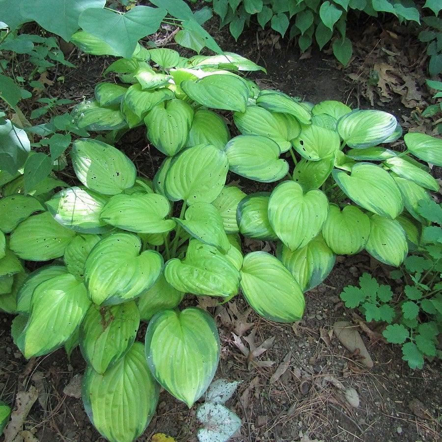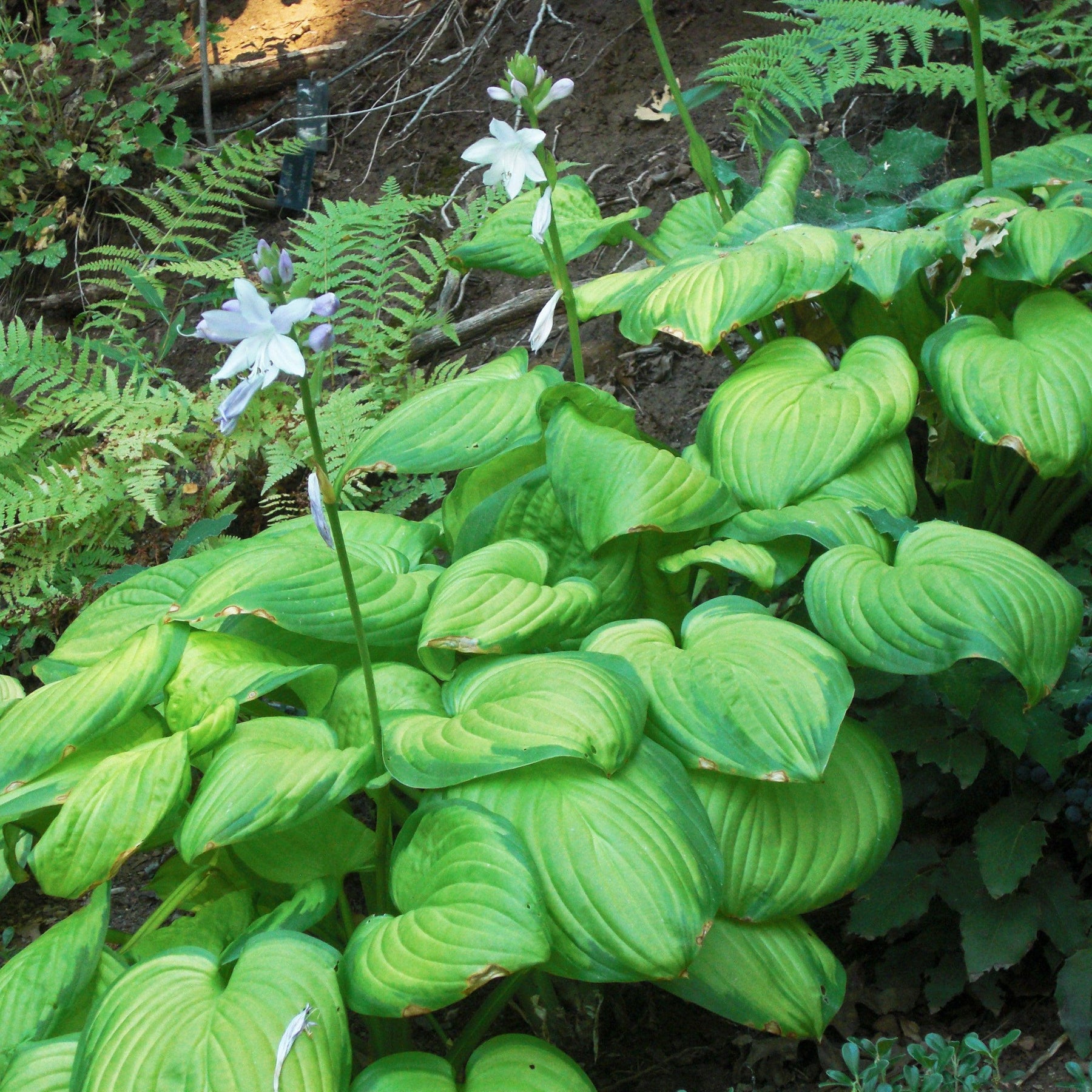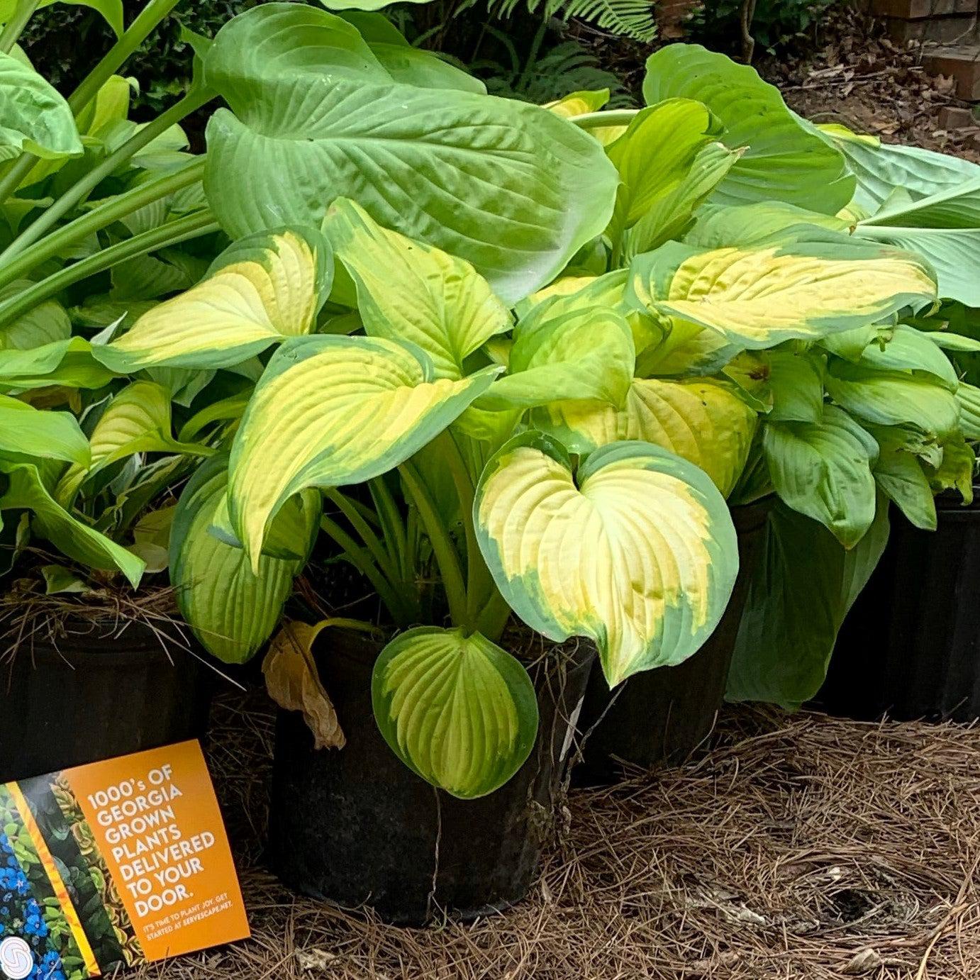 Hosta Stained Glass is a shade-loving herbaceous perennial primarily grown for its striking foliage. Hosta Stained Glass features large, leathery basal leaves that are bright gold with deep green margins and pronounced veins, creating a bold, luminous presence in the shade garden. In mid-summer, Hosta Stained Glass produces large bell-like pale purple flowers that rise above the foliage on tall stems, attracting butterflies and adding seasonal interest. Hosta Stained Glass performs best in partial sun and moist, well-drained soil, making it an excellent choice for borders, foundation plantings, and shaded garden beds.