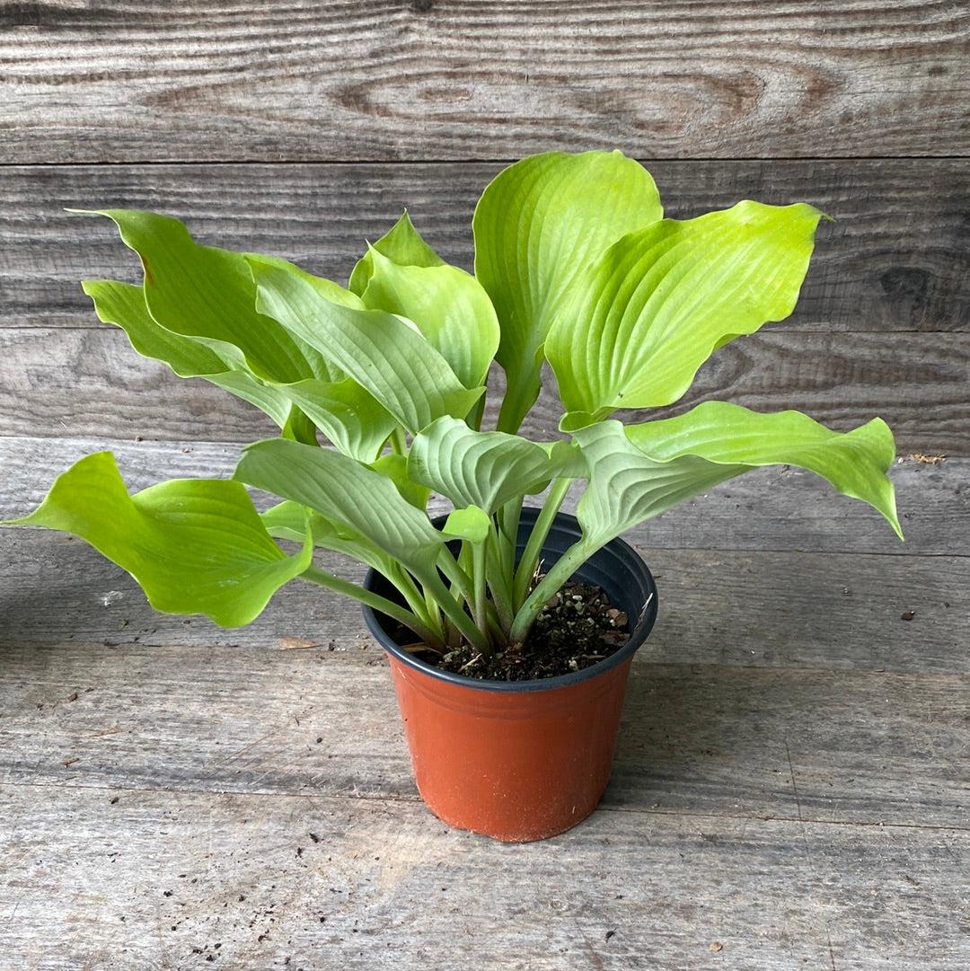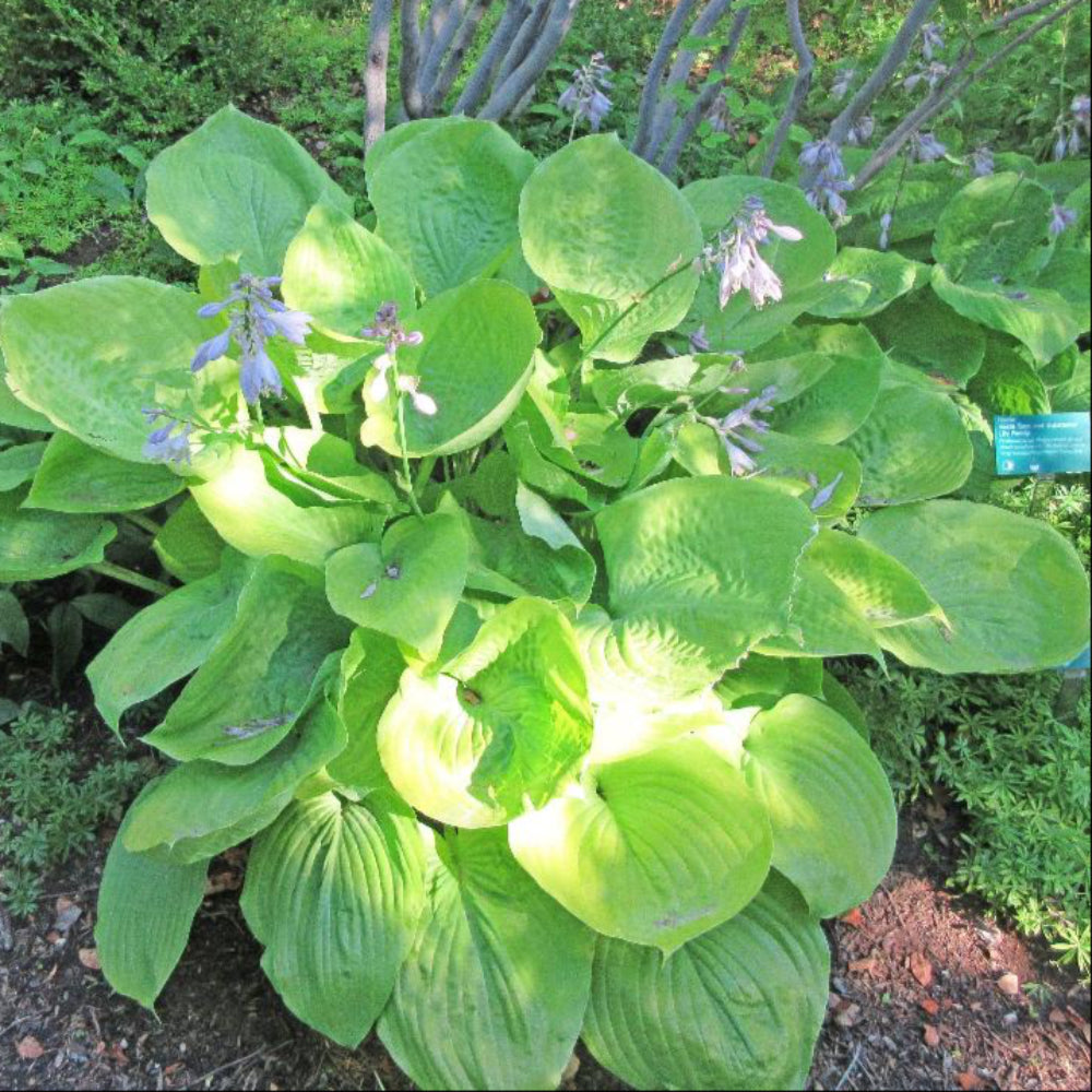 Hosta Sum and Substance is a large shade-loving herbaceous perennial primarily grown for its impressive foliage. Hosta Sum and Substance features huge heart-shaped basal leaves that open chartreuse-green and mature to a rich golden color, with deep veins that create bold texture and garden impact. In mid-summer, Hosta Sum and Substance produces small bell-like pale-lavender flowers that rise above the foliage on tall stems, attracting butterflies and adding seasonal interest. Hosta Sum and Substance performs best in partial sun and moist, well-drained soil, and it is known for resisting slug damage, making it an excellent choice for low-maintenance shade gardens and large borders.