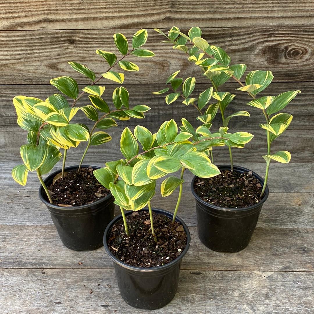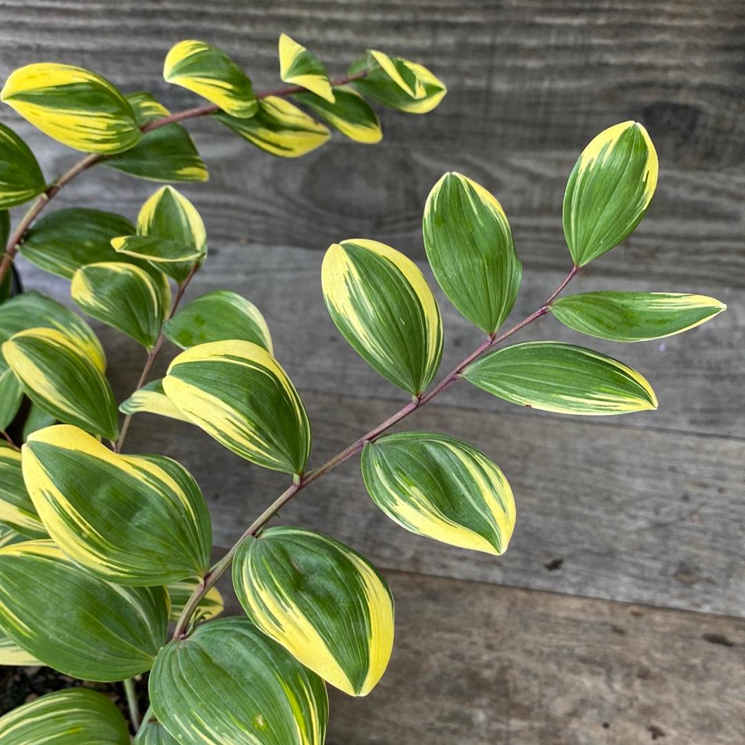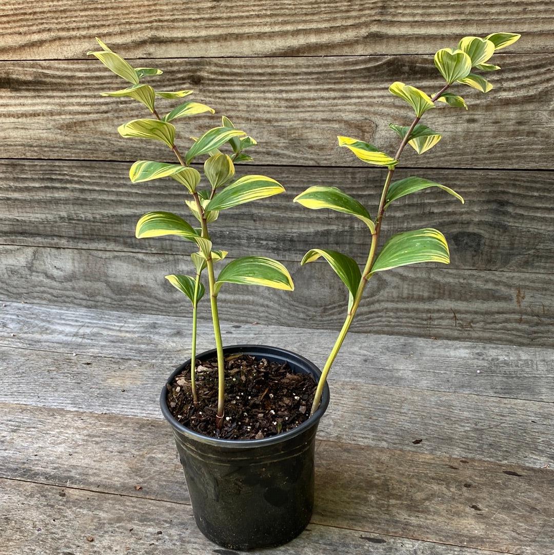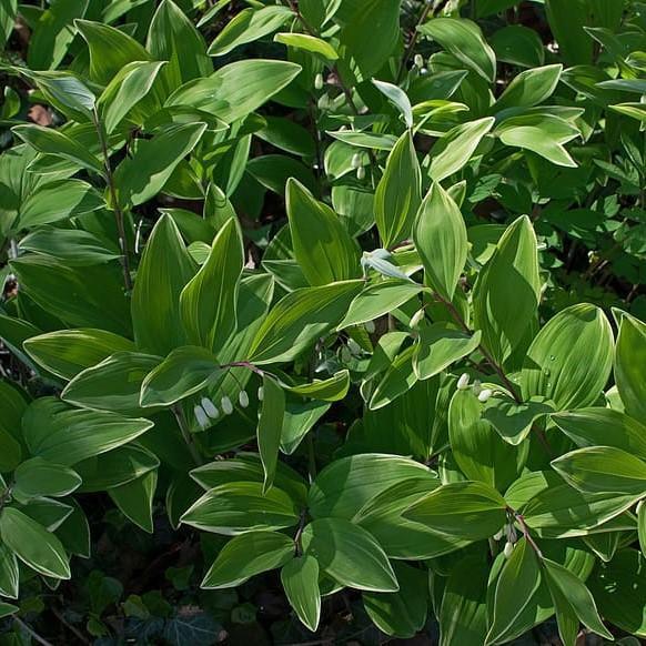 Variegated Solomon’s Seal is a shade loving herbaceous perennial with gracefully arching stems and rich green foliage with thin cream edges on red stems. Dangling clusters of small bell-shaped white flowers bloom from the leaf axils in spring. Best grown in part shade and rich moist well-drained soils. Tolerates both wet and dry soils.