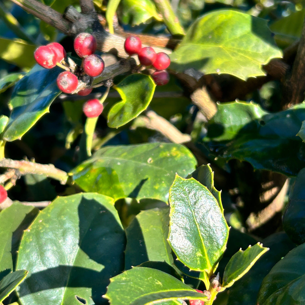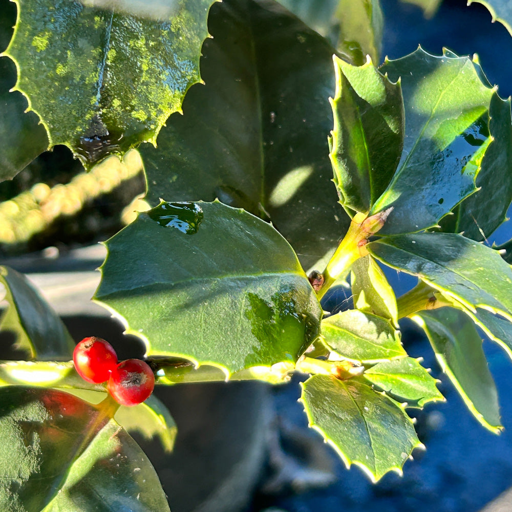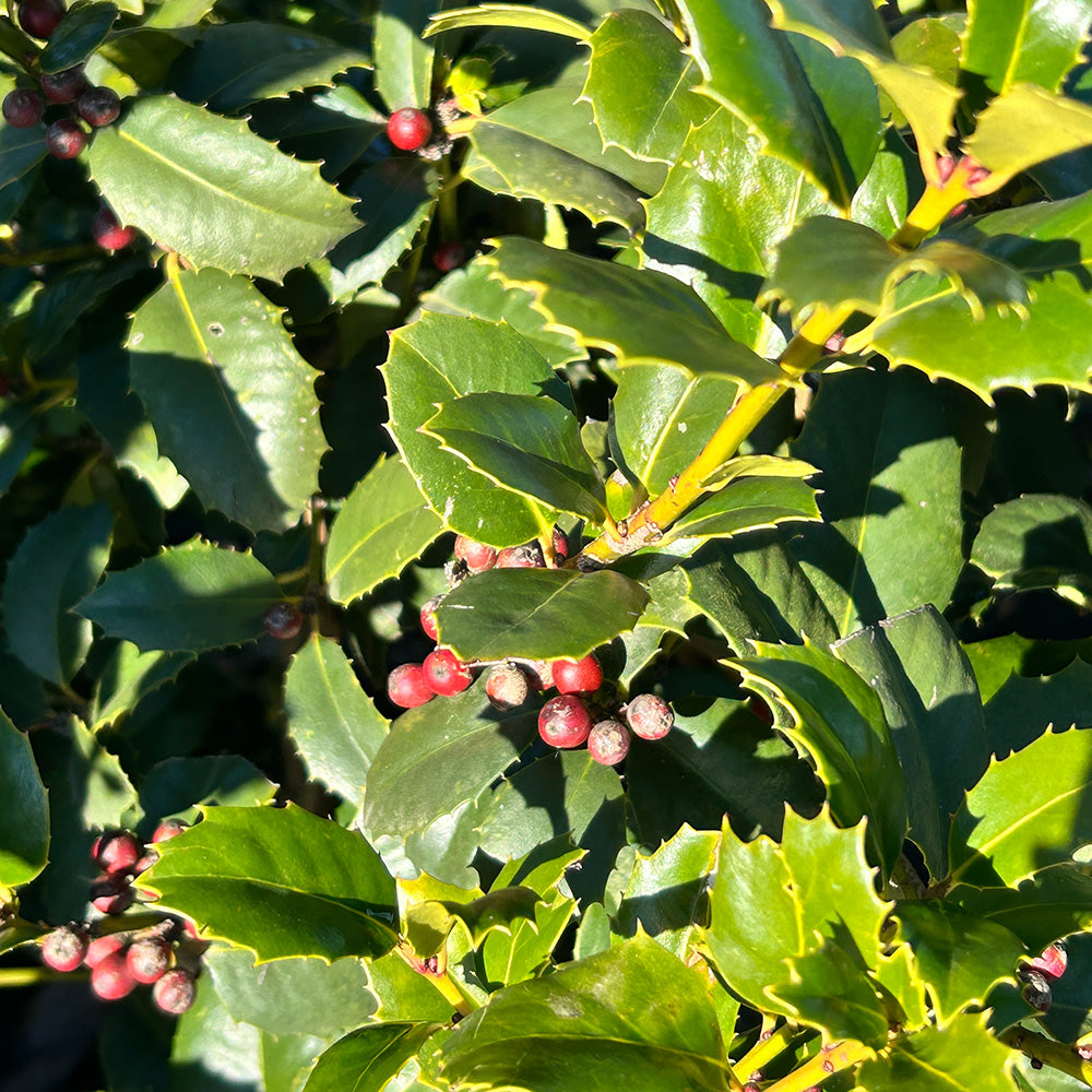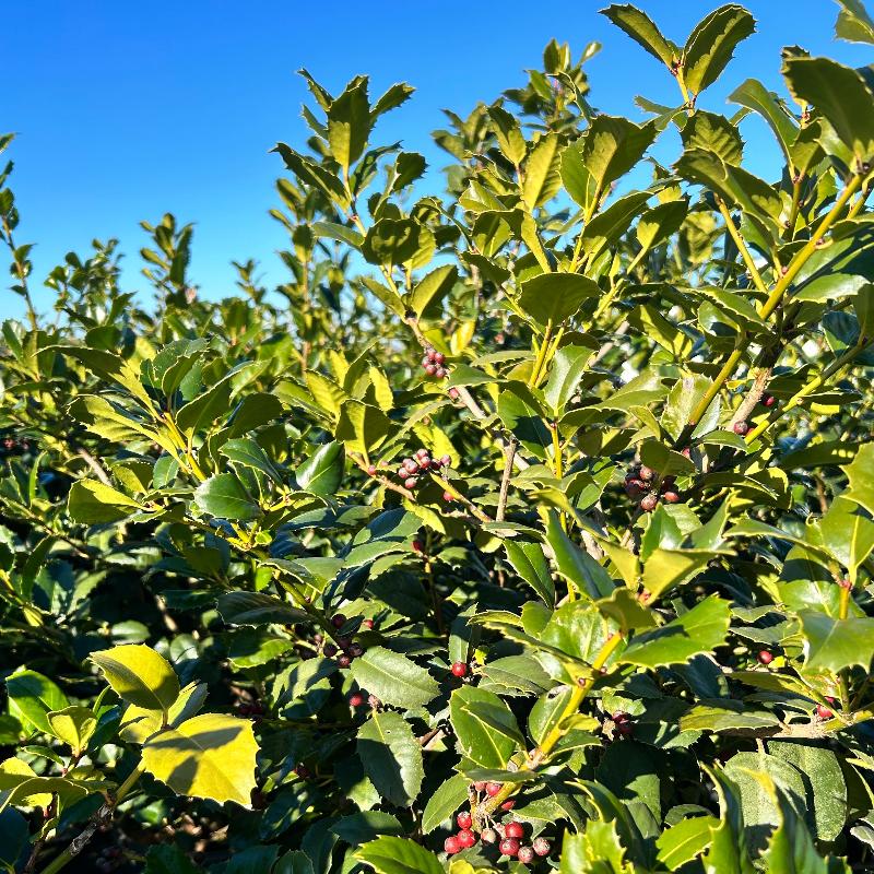 Emily Bruner Holly is a large dense evergreen shrub with a broad pyramidal habit and spiny deep green leaves. The clusters of inconspicuous flowers in spring need a male pollinator to give way to the heavy clusters of large bright red fruits in fall that lasts through winter. Best planted in moist, slightly acidic well-drained soils. Emily Bruner requires more nitrogen than other hollies to maintain its deep green foliage.