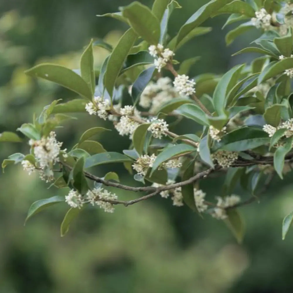 Osmanthus fragrans, Fragrant Tea Olive is a large densely branched evergreen shrub with dark green toothed foliage year round. The highly fragrant tiny white flowers grow in clusters along stems in fall. Best planted in part sun with acidic rich and moist well-drained soils. Drought tolerant once established.