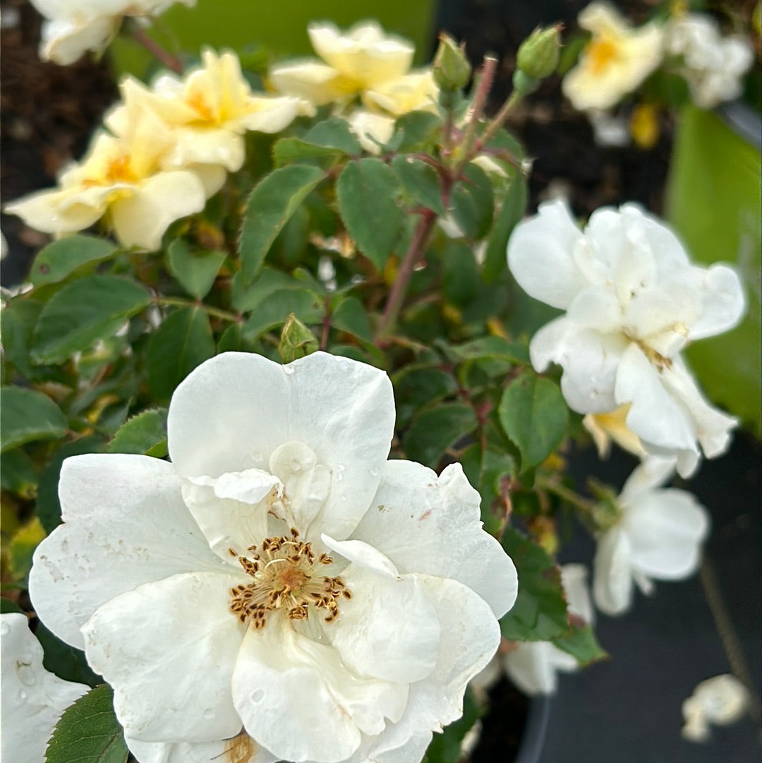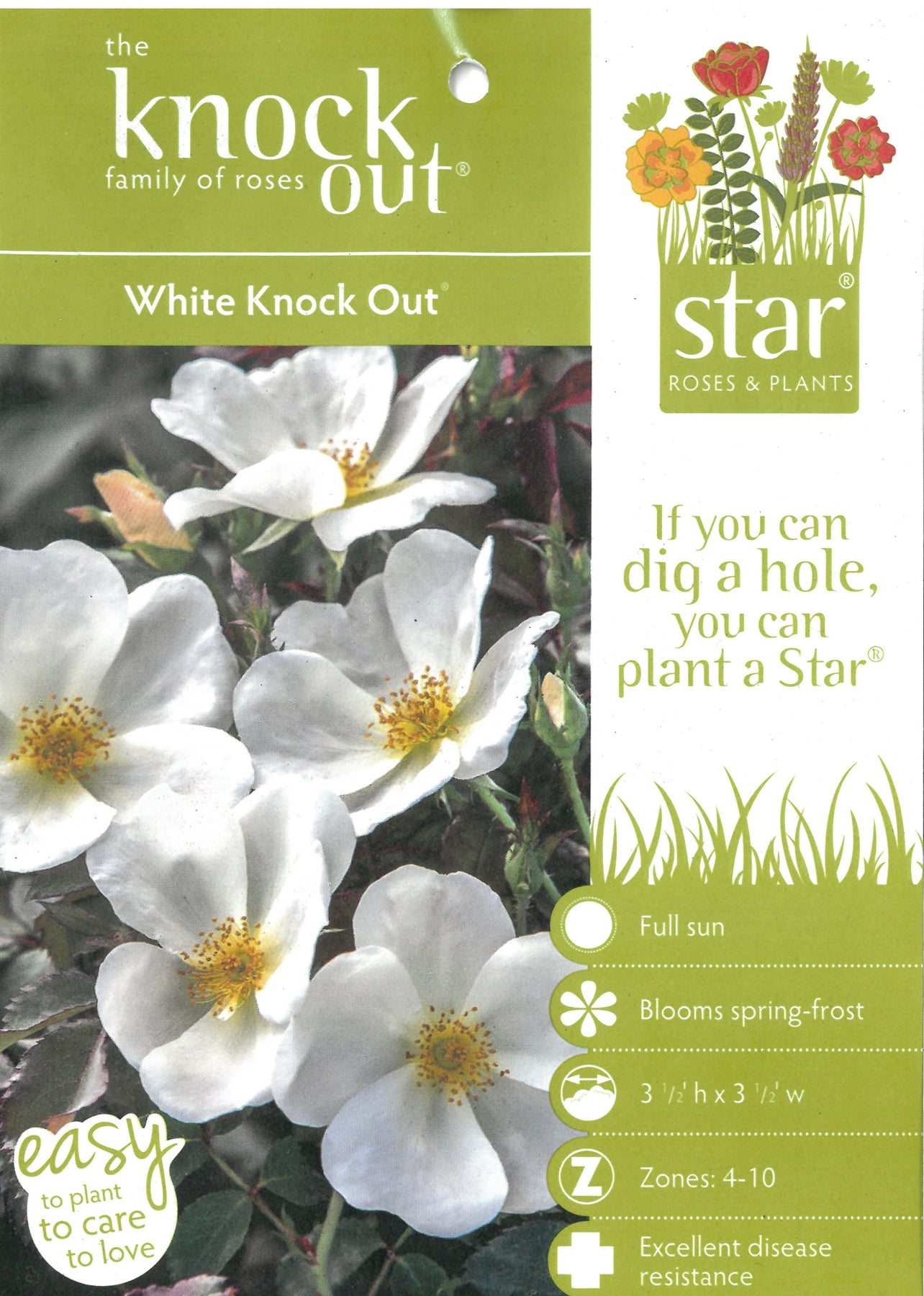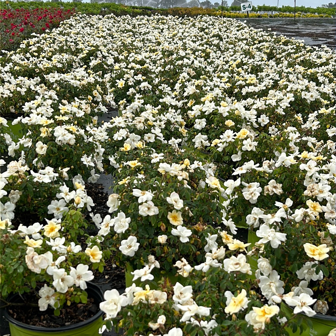 White Knock Out Rose is a continuous blooming upright deciduous shrub with abundant clusters of lightly fragrant pure white flowers that bloom from spring until the first frost. The deep almost black-green foliage has no fall color. Best grown in full sun and rich, moist, slightly acidic well-drained soils. Highly resistant to black spot and drought tolerant.