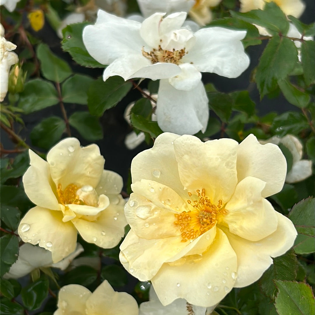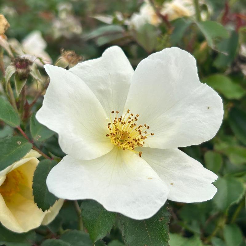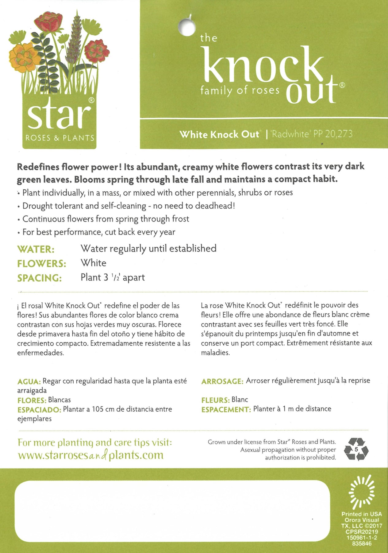 White Knock Out Rose is a continuous blooming upright deciduous shrub with abundant clusters of lightly fragrant pure white flowers that bloom from spring until the first frost. The deep almost black-green foliage has no fall color. Best grown in full sun and rich, moist, slightly acidic well-drained soils. Highly resistant to black spot and drought tolerant.