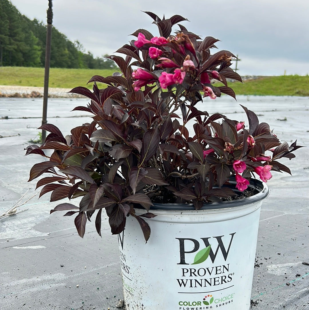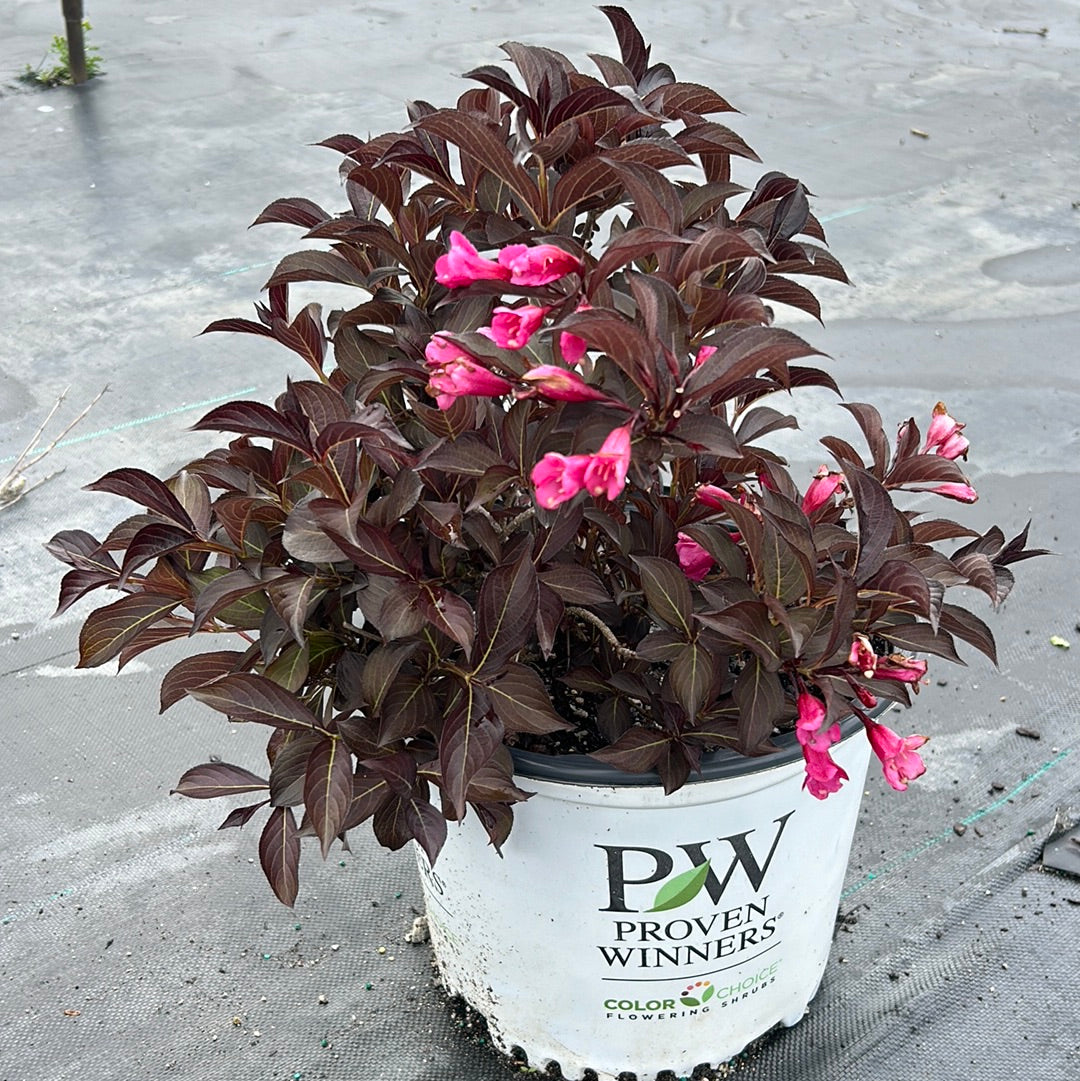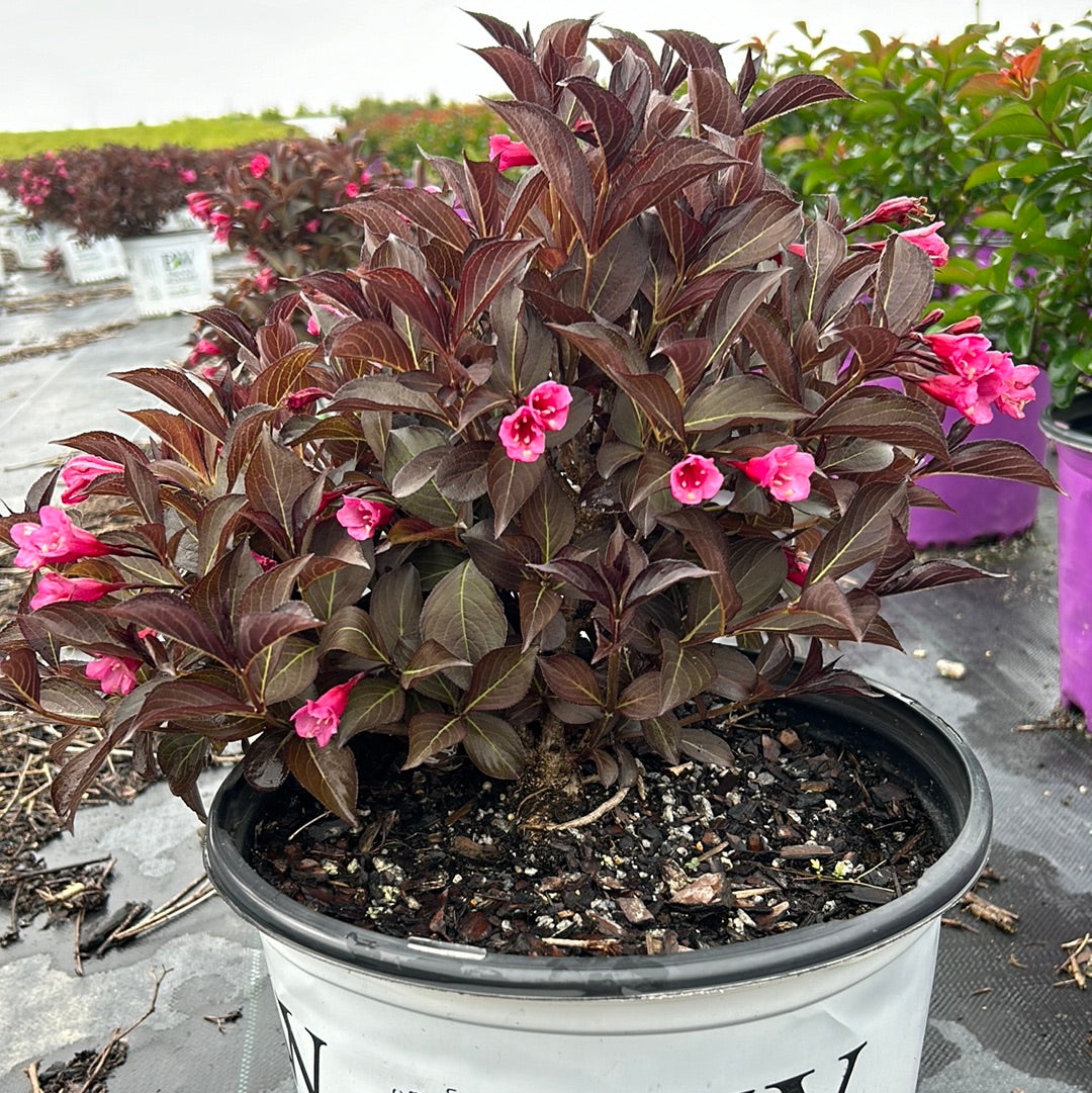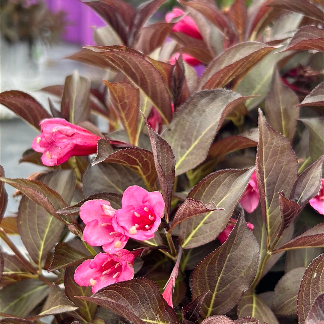 Wine & Roses Weigela is a mounding deciduous shrub with dense glossy dark purple foliage. Blooms of glossy rose-pink funnel-shaped flowers begin in late spring and return again with a lighter bloom in summer. Fall color and fruit are insignificant. Best flowering and color with full sun and rich, moist well-drained soils. Can tolerate some light shade.
