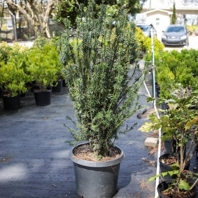 Cephalotaxus Fastigiata (Upright Japanese Plum Yew) is a carefree, slow-growing evergreen conifer shrub with an exceptionally dense upright habit. Cephalotaxus Fastigiata features glossy needle-like foliage in a deep blackish-green color that grows in a bottlebrush form and retains its color year-round. If edible fruits are desired, Cephalotaxus Fastigiata requires both a female plant and a male pollinator. This adaptable shrub prefers partial sun and rich, well-drained soils, and is drought tolerant once established. Cephalotaxus Fastigiata is an excellent choice for narrow spaces, formal hedges, or as a striking vertical accent in the landscape.