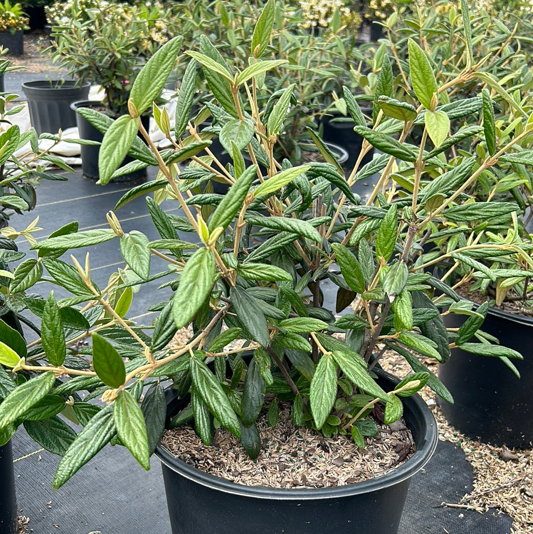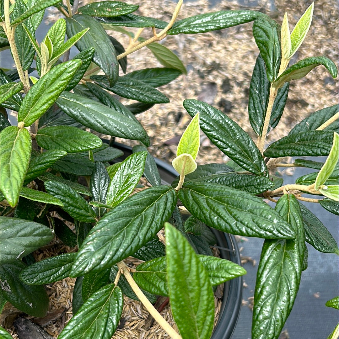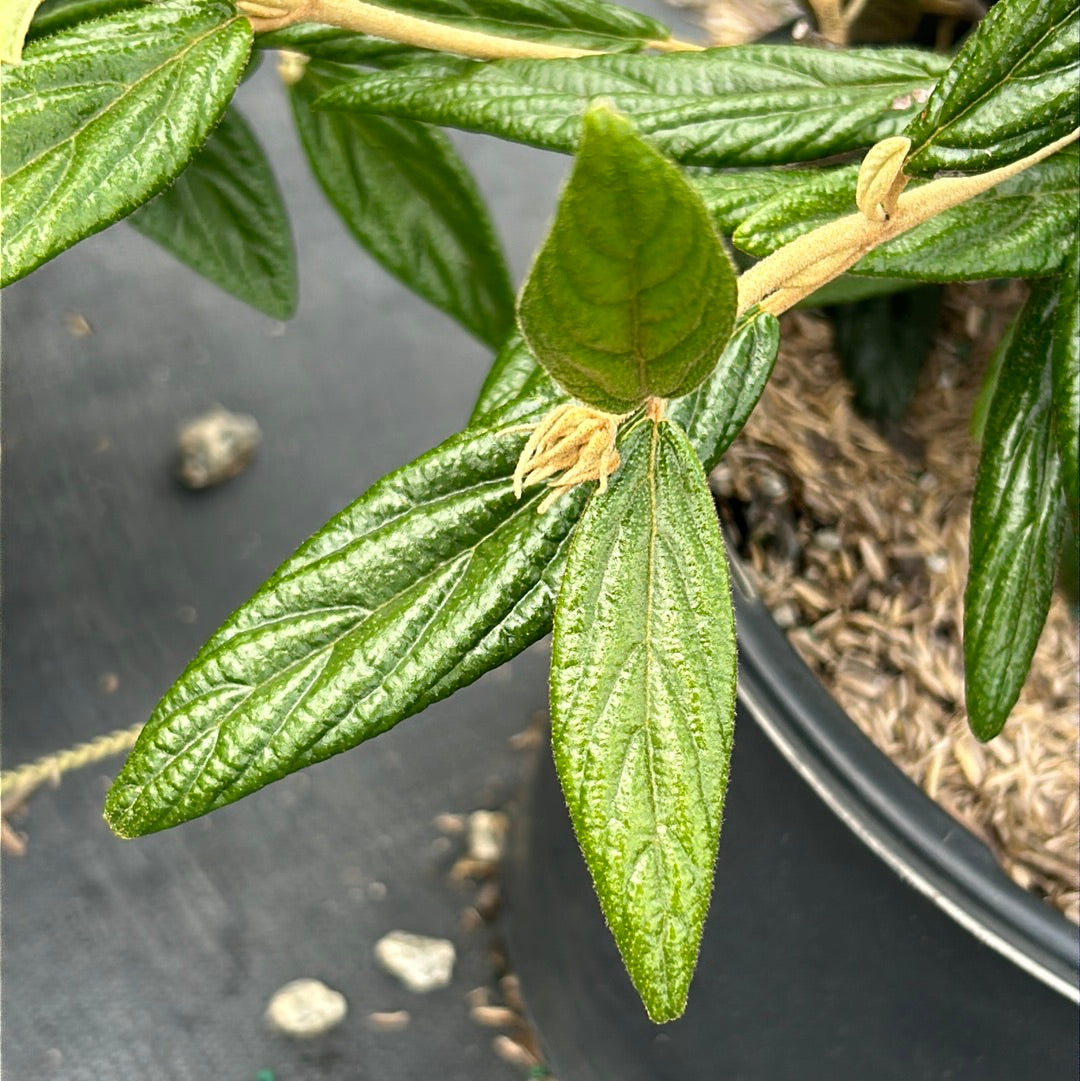 Prague Viburnum is a rounded multi-stemmed evergreen shrub with elliptic dark green leaves that turn burgundy in fall. Flat clusters of lightly fragrant creamy white flowers bloom in spring and give way to bright red berries that mature to black in fall. Flowers best with full sun and moist, lightly acidic well-drained soils. Drought tolerant once established.