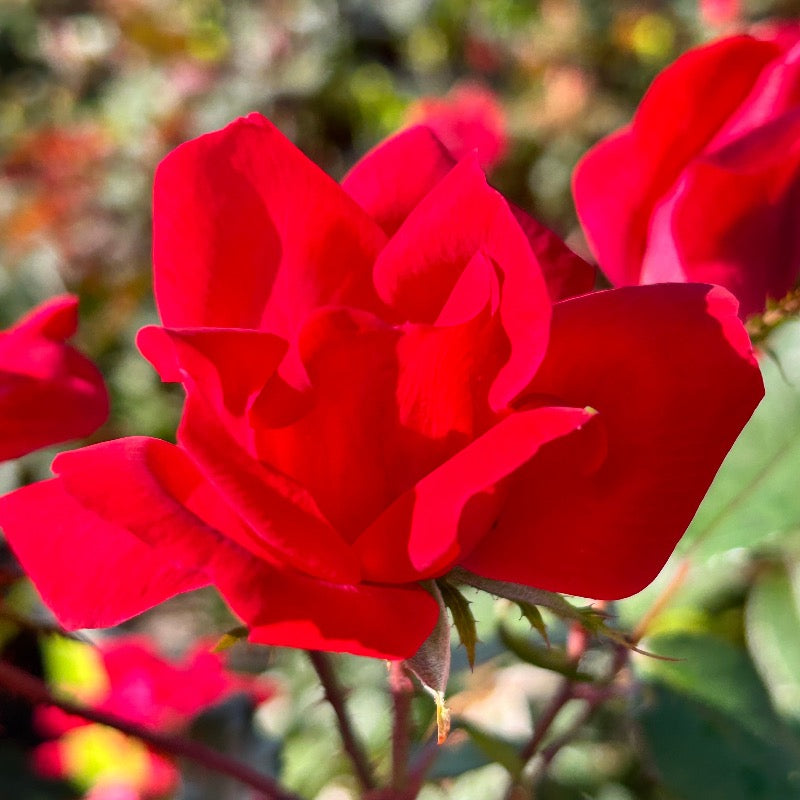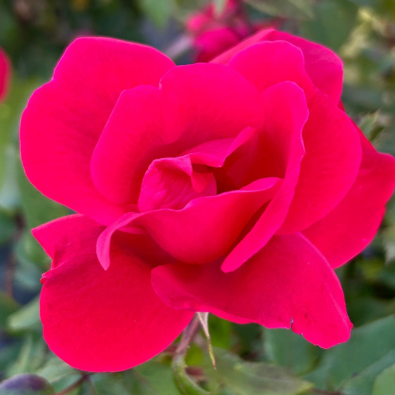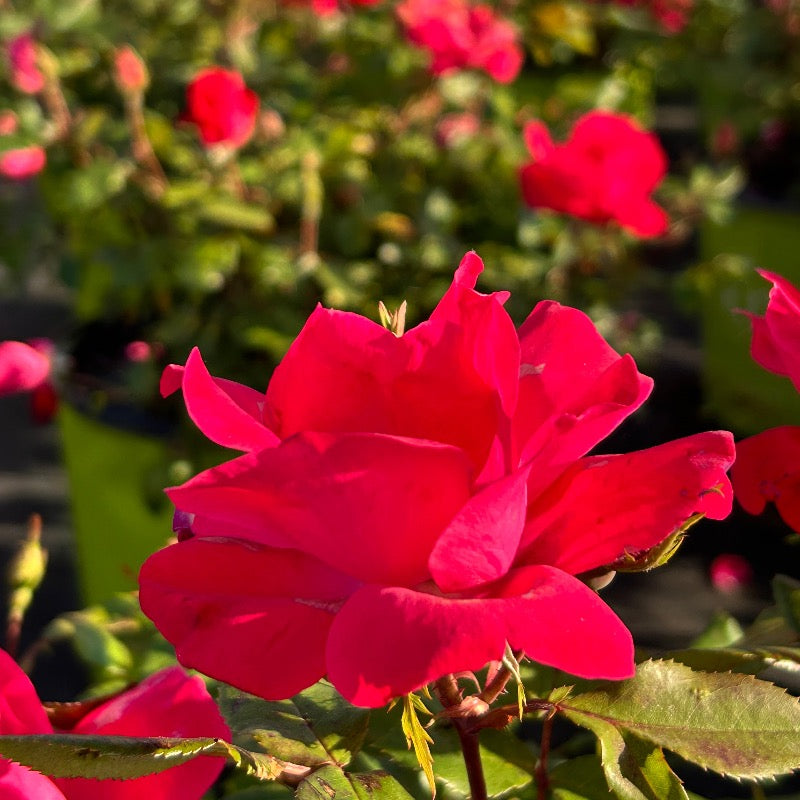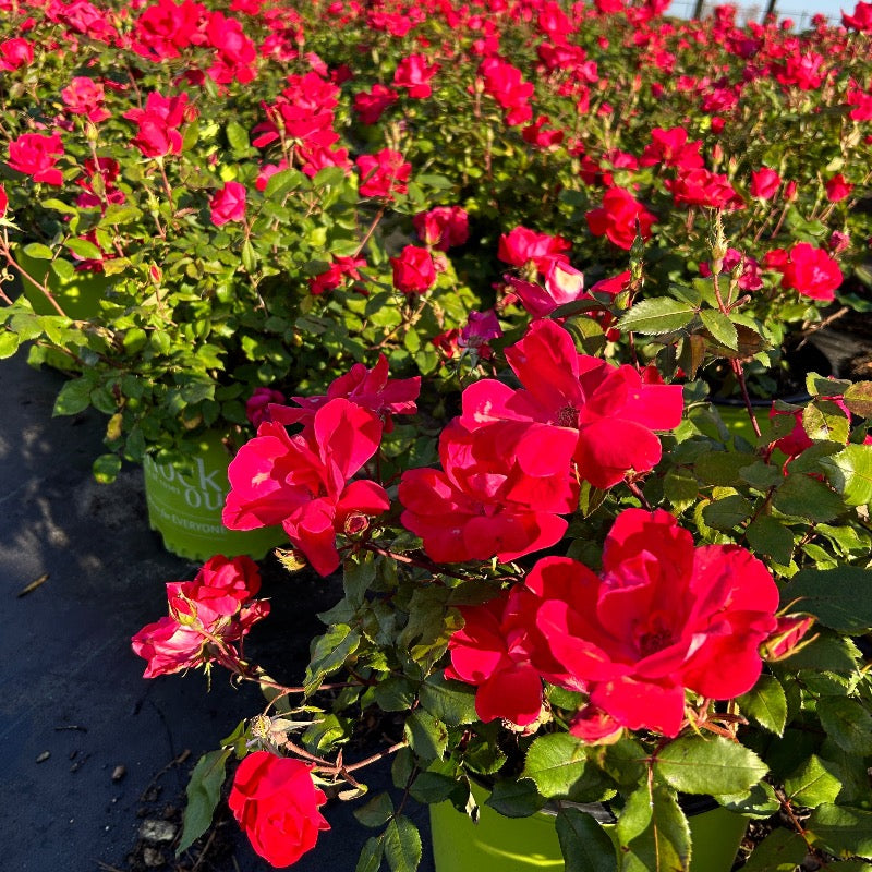 Knock Out Rose is a compact care-free deciduous shrub with serrated purplish-green foliage that turns purple to burgundy in fall. Fragrant clusters of large cherry red flowers bloom from late spring until the first frost, and are followed by orange-red rose hips. Best grown in full sun and rich, moist, slightly acidic well-drained soils. Knock Out is highly resistant to common rose diseases and drought tolerant.