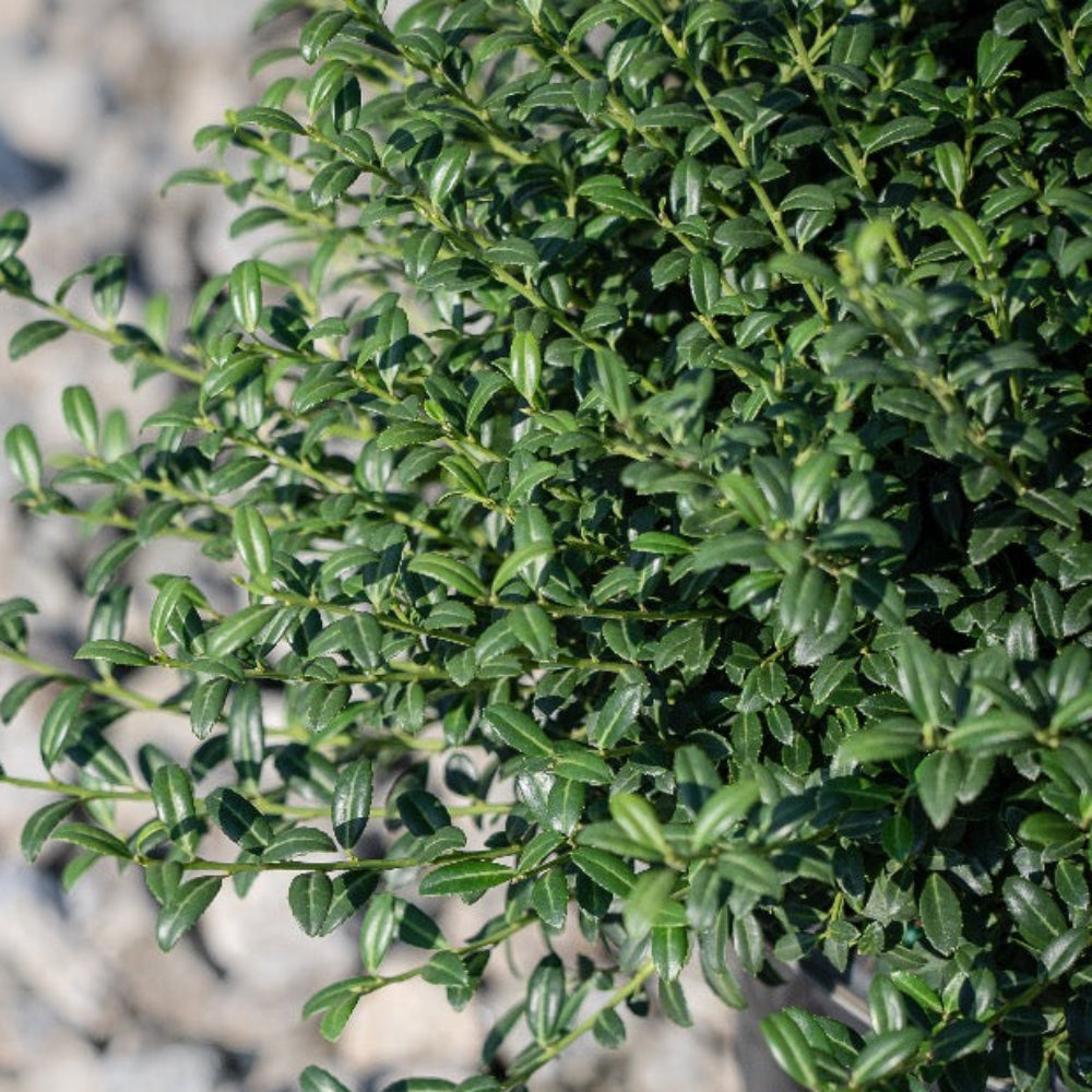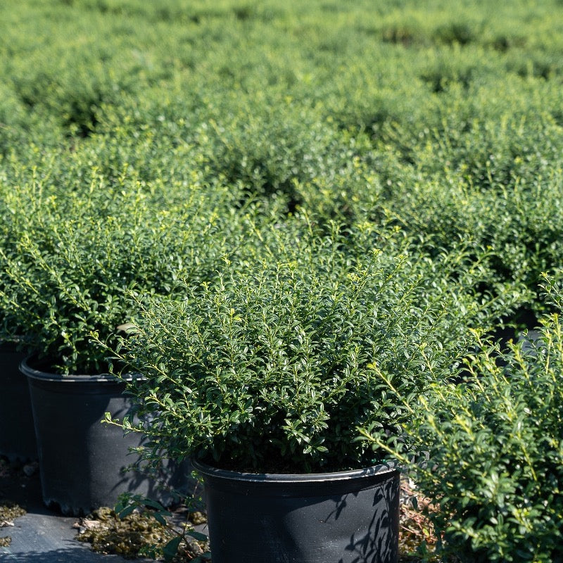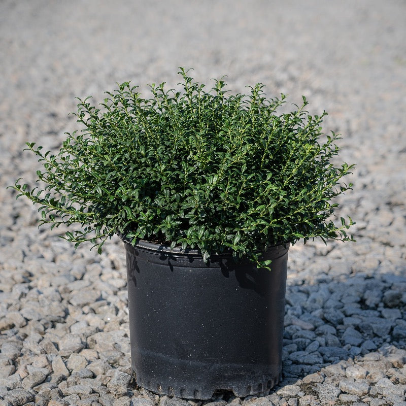 Ilex Soft Touch (Japanese Holly) is a soft-textured, evergreen shrub prized for its compact rounded habit and small, dark green, spineless leaves featuring a subtle silver mid-vein for added visual interest. In spring, Ilex Soft Touch produces inconspicuous flowers that, when pollinated by a nearby male holly, develop into small black berries in fall, persisting through winter and providing subtle seasonal color. Ideal for low hedges, foundation plantings, and mixed shrub borders, Ilex Soft Touch thrives in moist, slightly acidic, well-drained soils and adapts well to sun or partial shade. Gardeners value Ilex Soft Touch for its elegant evergreen foliage, low-maintenance growth, and ornamental fruit display when paired with male hollies. Its rounded form and soft texture make it a versatile choice for formal or naturalistic landscapes.