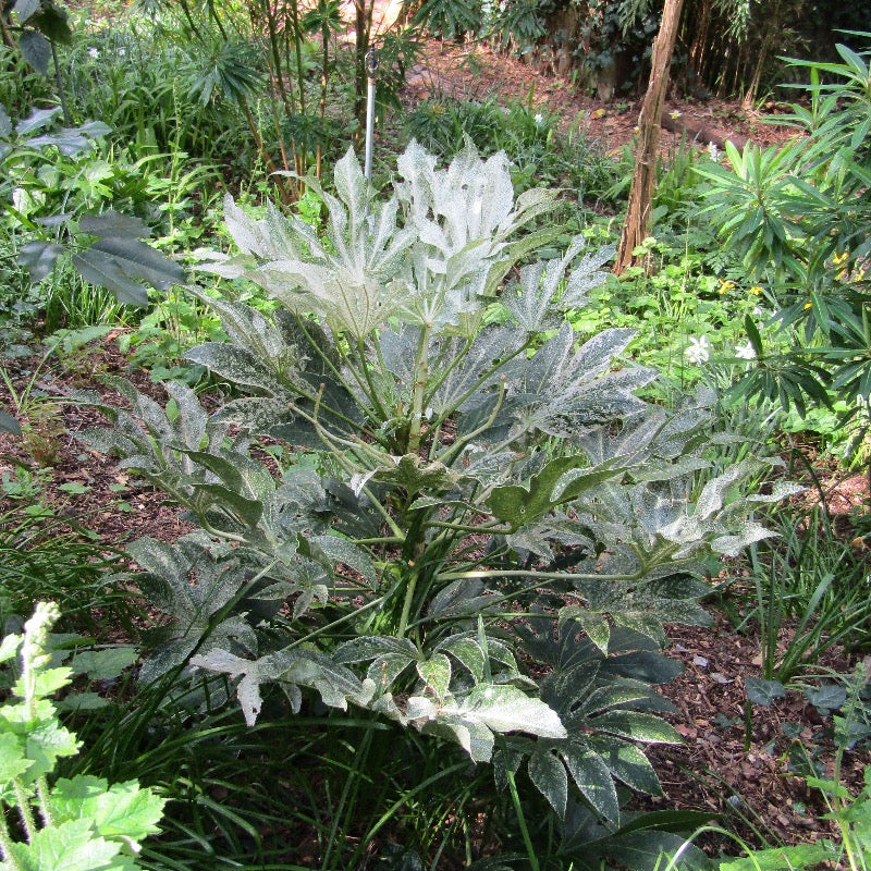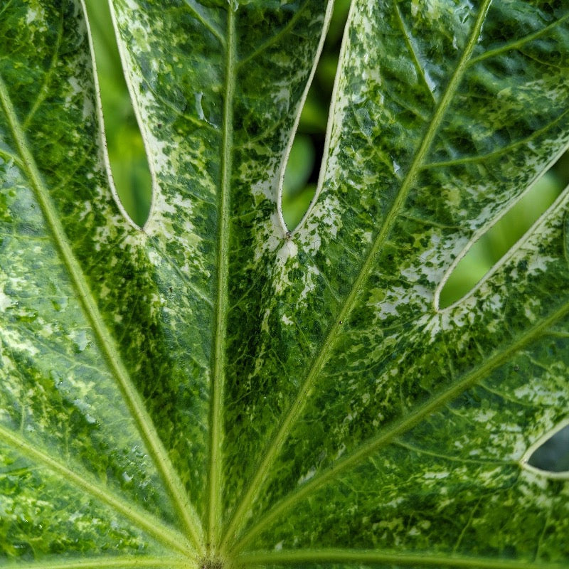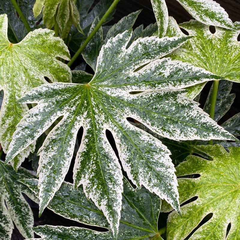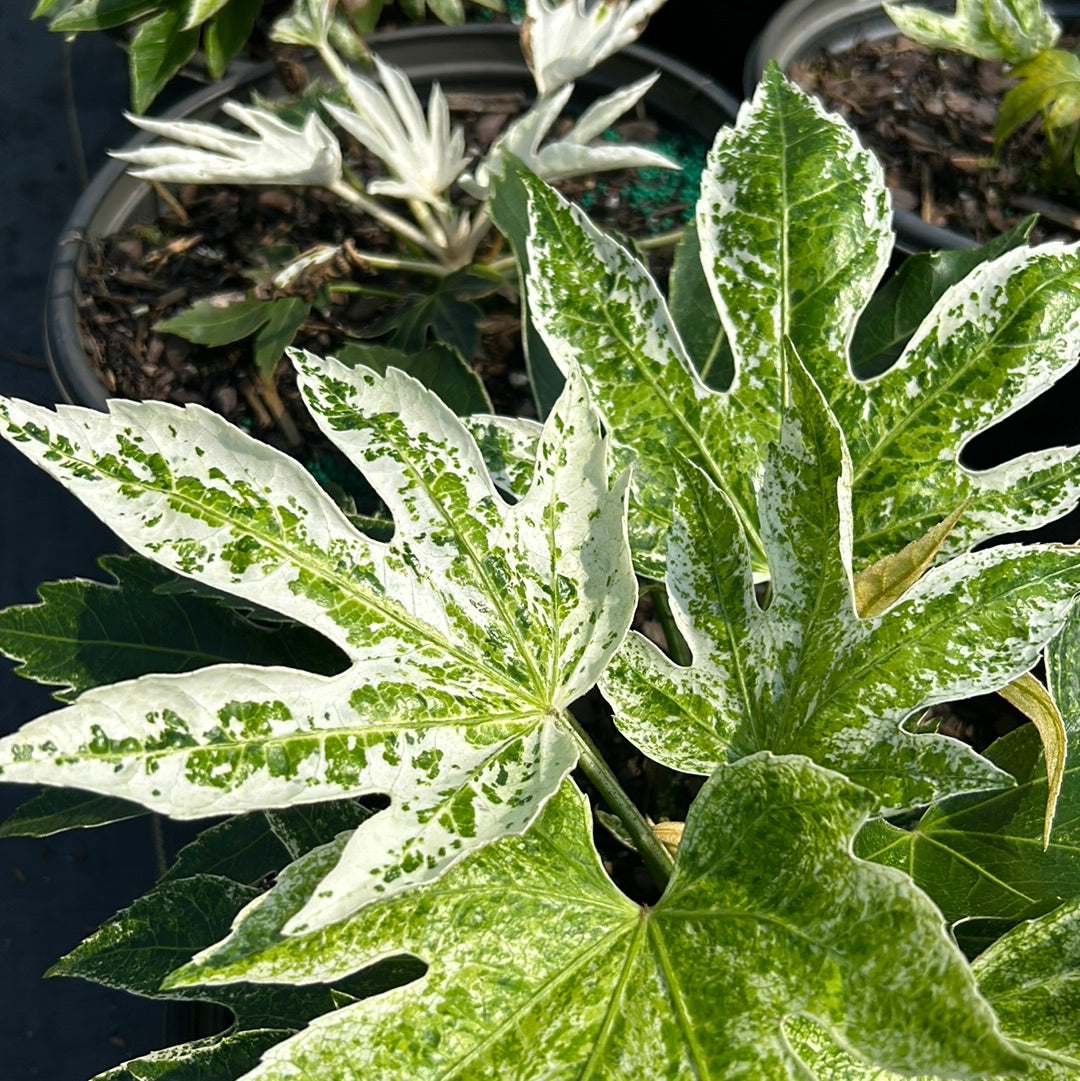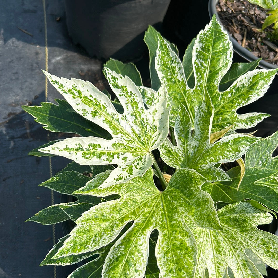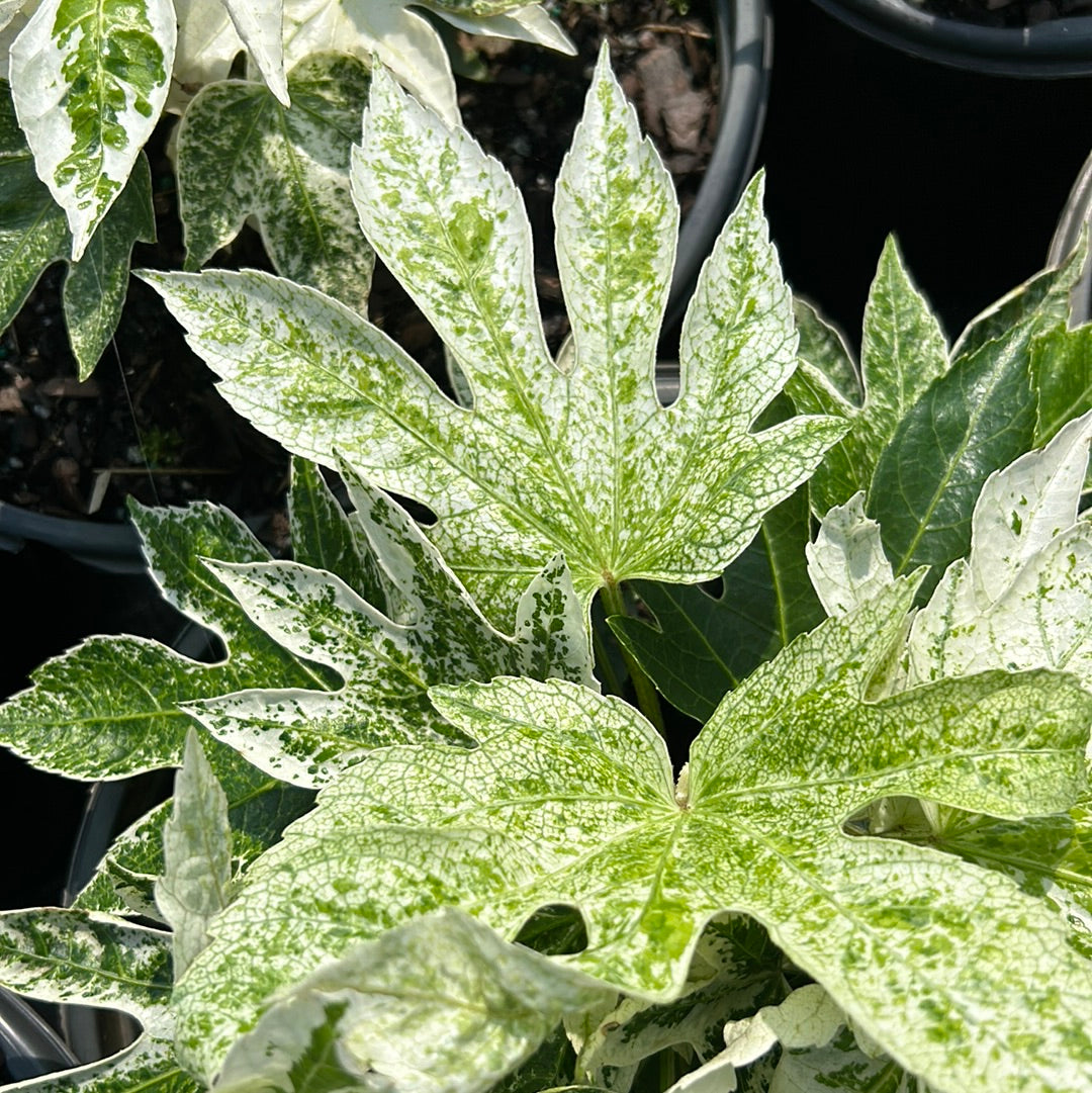 Fatsia ‘Spider’s Web’ is a small, exotic evergreen shrub prized for its dramatic, variegated foliage and architectural form. This distinctive Japanese Aralia features huge, deeply lobed, palmate leaves that emerge glossy dark green and gradually develop a striking white speckled variegation. Over approximately three years, the variegation intensifies and spreads toward the center of each leaf, creating a bold, eye-catching display.