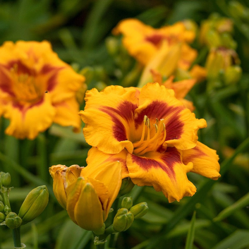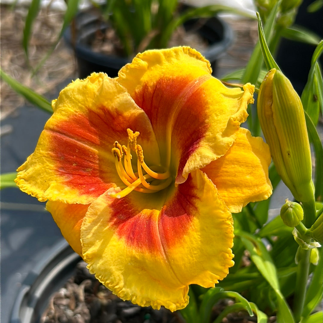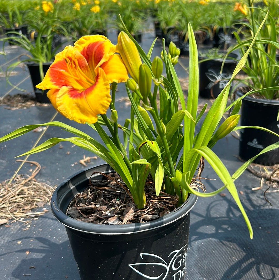 Island Bonfire Daylily is a compact re-blooming semi-evergreen perennial with strap-like deep green foliage. Its early bloom of ruffled golden flowers with a fiery eye continues throughout summer into fall attracting butterflies and pollinators. Best bloom in deep rich well-drained soils.