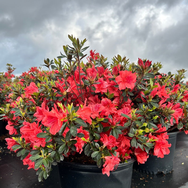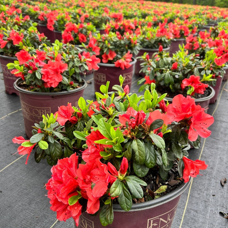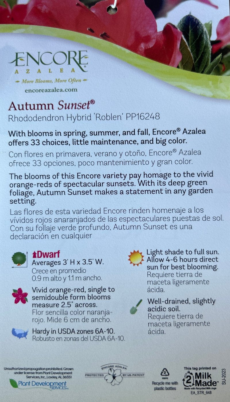 Azalea Encore® Autumn Sunset® is a compact, low-growing evergreen azalea shrub with small green foliage. Azalea Encore® Autumn Sunset® produces masses of 2.5-inch red-orange flowers that bloom first in mid-spring and continue to rebloom into fall, providing long-lasting color throughout the season. This versatile azalea performs best in partial sun and thrives in acidic, rich, well-drained soils. Azaleas are excellent pollinator and butterfly attractors, making Azalea Encore® Autumn Sunset® a beautiful choice for foundation plantings, woodland gardens, and mixed shrub beds.