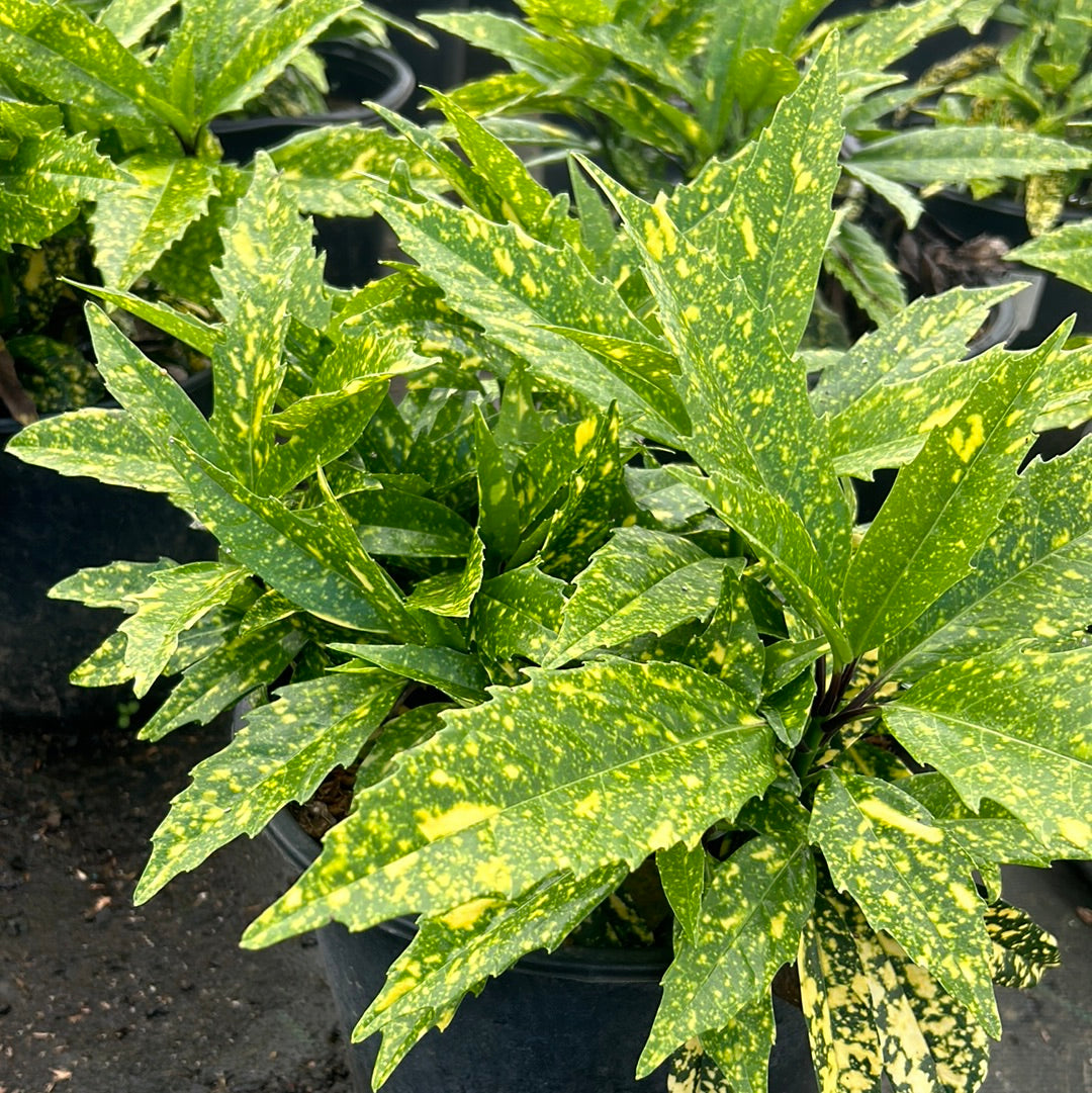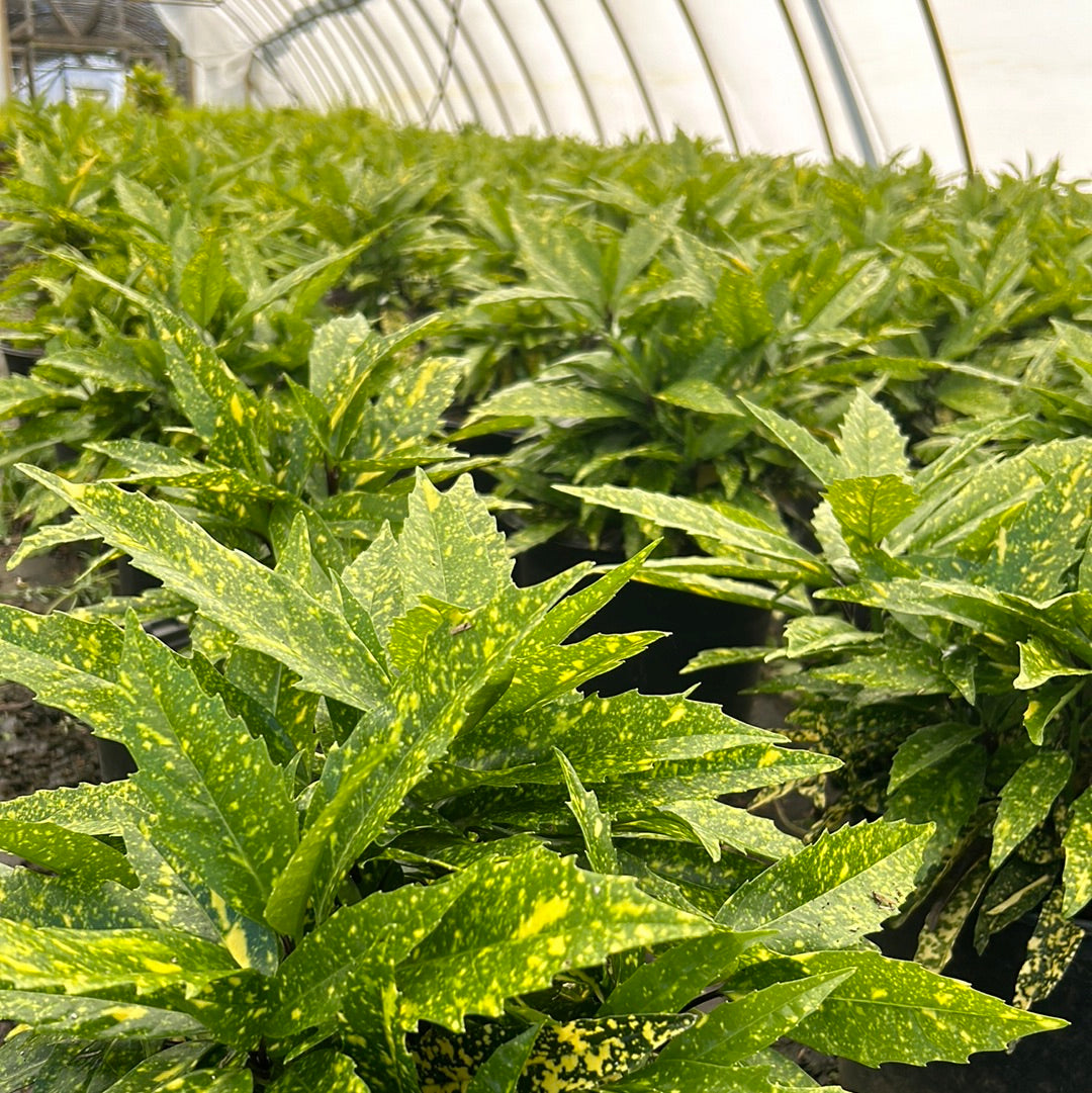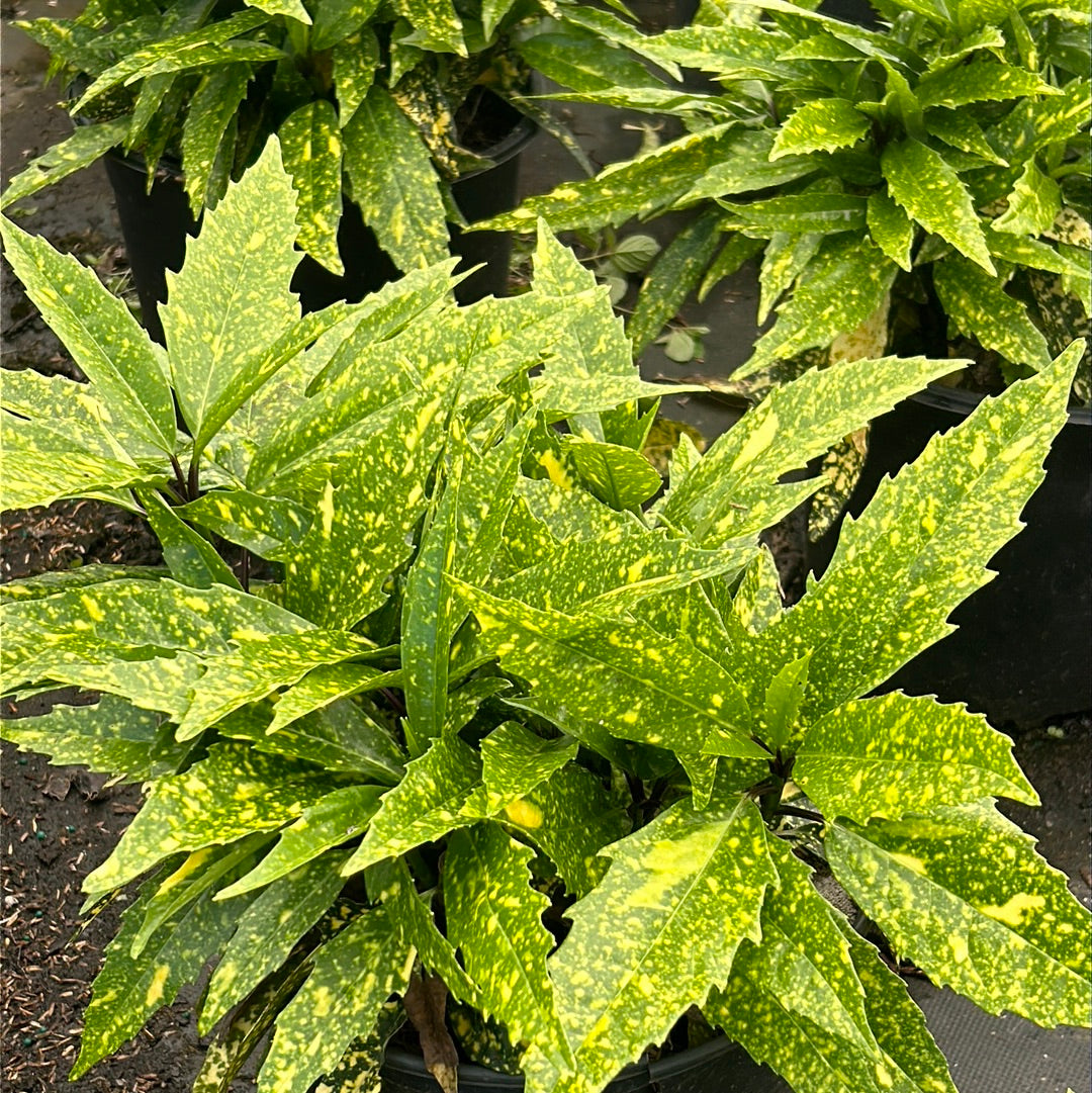 Aucuba Hosaba Hoshifu is a compact female cultivar of a shade-loving evergreen shrub known for its distinctive foliage. Aucuba Hosaba Hoshifu features narrow, glossy, deep green serrated leaves heavily splashed with bright yellow, adding bold color to shaded landscapes. When grown in full shade, the branches of Aucuba Hosaba Hoshifu may arch and reach the ground, creating a graceful, layered form. Small maroon flowers appear in early spring, followed by bright red berries that ripen in fall and persist through winter into spring when a male pollinator is present. Aucuba Hosaba Hoshifu prefers rich, moist, well-drained soils and performs best in partial to full shade. Deer resistant and easy to maintain, Aucuba Hosaba Hoshifu is an excellent choice for foundation plantings, shade borders, and woodland gardens.