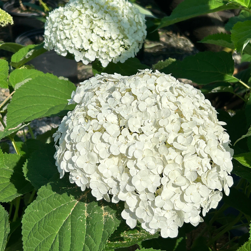 Incrediball Smooth Hydrangea is a reblooming dwarf deciduous shrub with serrated jade green foliage and no fall color. The sturdy stems don’t flop under the weight of its massive soft white panicle balls that bloom from midsummer until the first frost attracting butterflies and pollinators. Blooms best in partial sun and rich, moist well-drained soils. Incrediball Smooth Hydrangea is a self cleaning variety, no deadheading needed.