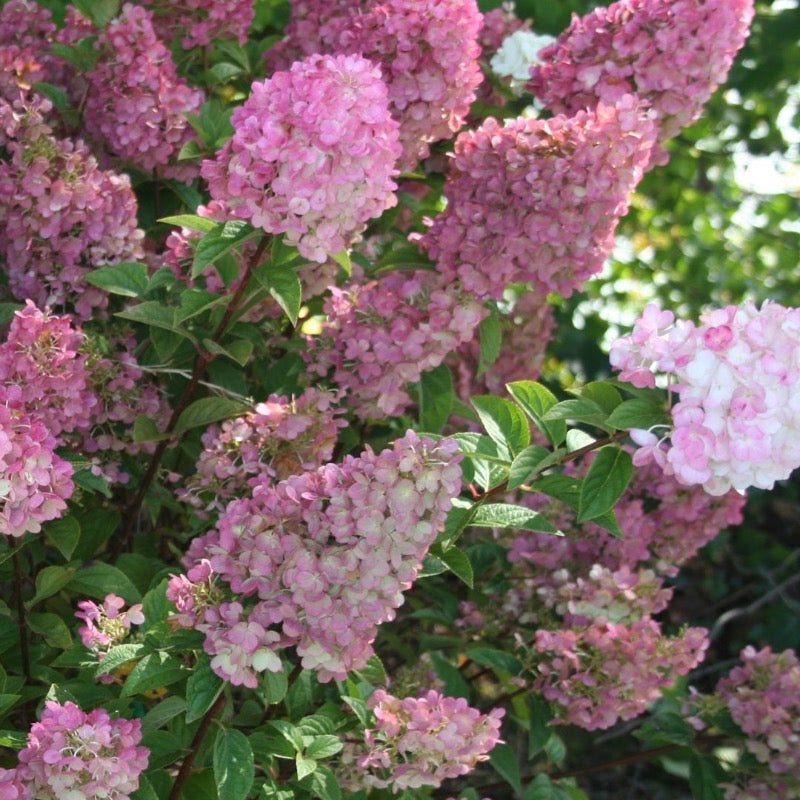 Strawberry Sundae Hydrangea is a compact deciduous shrub and flowers both on old and new wood. The heavy panicles arch the branches as they bloom white and mature pink, then red and persist until frost attracting butterflies. While it can tolerate full sun, its best blooms are in part sun and rich, moist well-drained acidic soils.