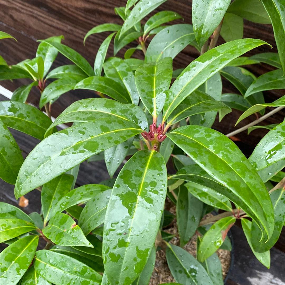 Illicium Aztec Fire is a pyramidal evergreen shrub featuring glossy, aromatic dark green foliage. From mid-spring into fall, Illicium Aztec Fire produces fragrant, quarter-sized burgundy red flowers that add vibrant color and scent to your garden. Thriving in part sun with moist soils, Illicium Aztec Fire is an ideal choice for borders, containers, or shaded garden spaces.