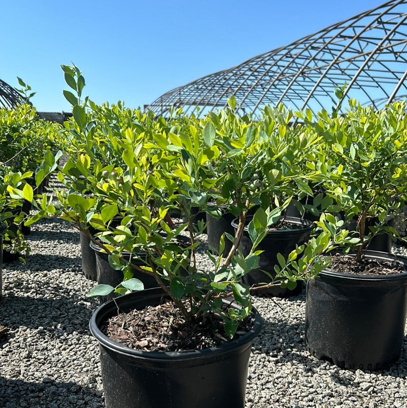 Powderblue Rabbiteye Blueberry is a tall vigorous upright deciduous shrub with a high chill requirement but very high production of firm sweet powdery light blue blueberries that ripen late.  The large elliptical blue-green foliage turns shades of yellow-orange in fall. The white flower clusters bloom in spring. Grows best with full sun and rich, moist acidic well-drained soils.  Powderblue resists cracking after rain.  Should be planted with others to cross-pollinate to increase yield.