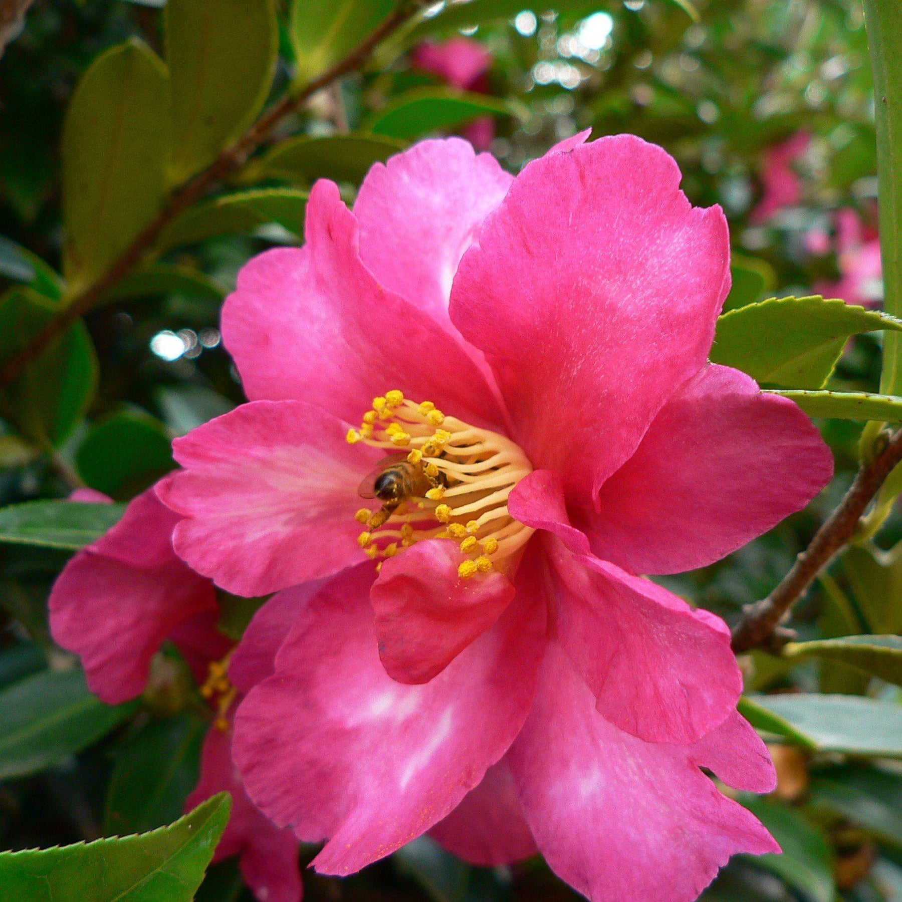 From mid-fall into winter, Camellia Bonanza produces abundant semi-double crimson-pink flowers highlighted by bright yellow stamens, creating bold seasonal color when most plants are dormant. The blooms attract butterflies and pollinators, making this camellia both beautiful and beneficial.