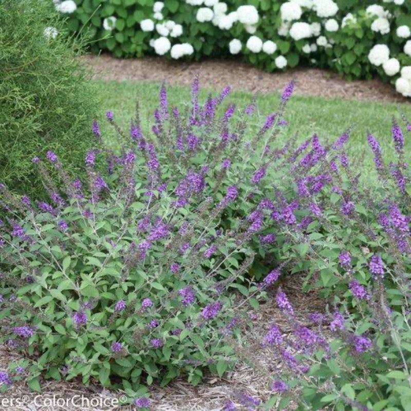 Buddleia Lo & Behold® Blue Chip Jr. is a well-branched dwarf butterfly bush with a dense, spreading habit and dark green leaves with a silvery hue. This compact shrub produces terminal spikes of fragrant lavender-blue flowers that bloom continuously from summer into fall, attracting butterflies and pollinators.