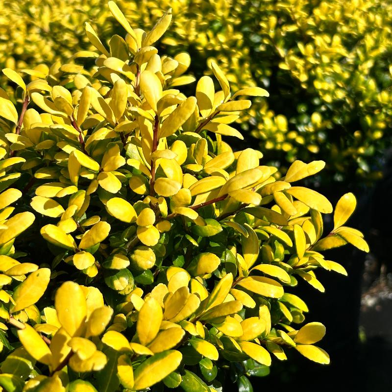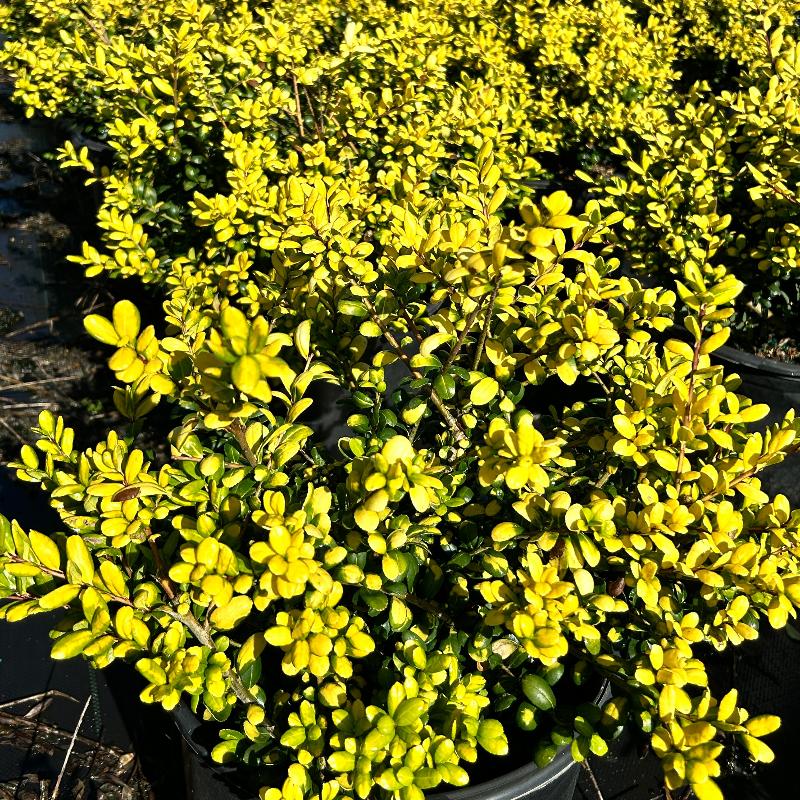 Ilex Drops of Gold Holly is an upward-spreading evergreen shrub valued for its striking variegated foliage that changes depending on sun exposure. In full sun, the leaves of Ilex Drops of Gold Holly develop vibrant gold tones splashed with yellow, while inner growth and shaded areas display softer yellow-green coloration for beautiful contrast. Small, inconspicuous spring flowers on Ilex Drops of Gold Holly may develop into small black berries in fall when properly pollinated, adding seasonal interest that can last through winter. Ideal for borders, foundation plantings, and mixed evergreen beds, Ilex Drops of Gold Holly thrives in moist, slightly acidic, well-drained soils. As a dioecious holly, male and female plants are required nearby for reliable fruit production, making this variety both ornamental and beneficial for wildlife-friendly landscapes.