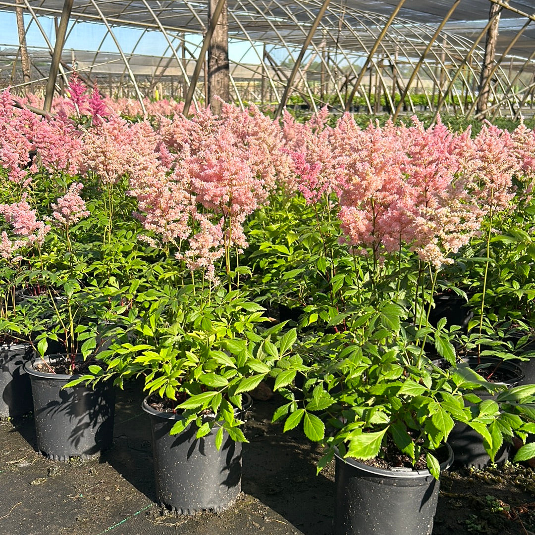 Astilbe Europa is a clumping herbaceous perennial prized for its deeply divided, dark green, fern-like foliage. In late spring through summer, Astilbe Europa produces feathery tufts of soft light pink panicles that rise gracefully above the leaves. Astilbe Europa flowers best in part shade and thrives in rich, consistently moist soils, making it an excellent choice for shaded borders and woodland gardens. Deer and rabbit resistant, Astilbe Europa is a reliable, low-maintenance perennial that adds elegant color and texture to the landscape.