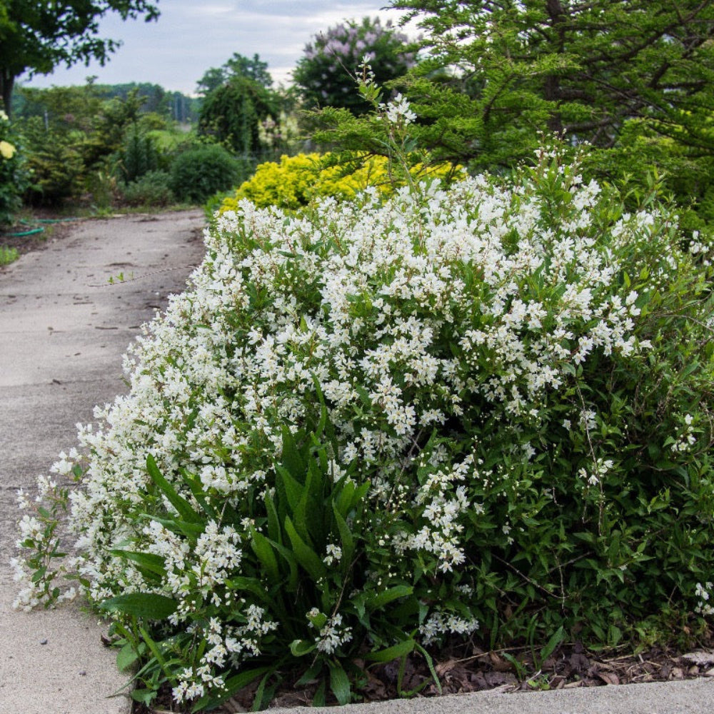 In early spring, Deutzia Nikko is covered in tiny, fragrant white flowers held on upright panicles, providing a beautiful floral display for approximately two weeks. This dwarf shrub blooms best in full sun and thrives in moist, well-drained soil. Easy to maintain and reliable, Deutzia Nikko is a great choice for adding early-season color, texture, and fall interest to the landscape.