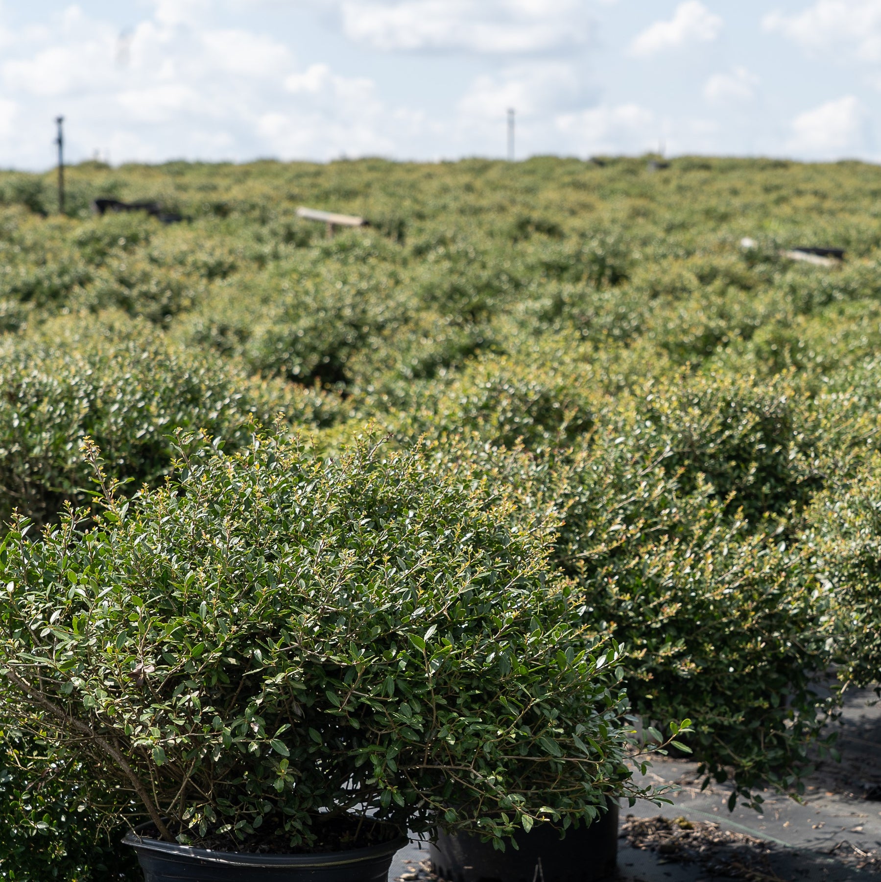 Ilex Schillings (Holly) is a very dense, slow-growing, dwarf evergreen shrub native to North America, prized for its fine, dark green foliage and compact, tidy form. As a heavily flowering male cultivar, Ilex Schillings is a highly effective pollinator, making it an essential companion for female hollies to ensure berry production. Ideal for small hedges, foundation plantings, or mixed shrub borders, Ilex Schillings Holly thrives in moist, slightly acidic, well-drained soils and performs well in both sun and partial shade. Gardeners value Ilex Schillings for its slow, manageable growth, ornamental foliage, and reliable role as a pollinator in dioecious holly plantings. While it does not produce fruit itself, Ilex Schillings supports nearby female hollies by providing pollen, making it both practical and attractive in wildlife-friendly landscapes.