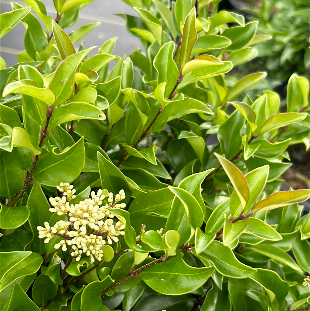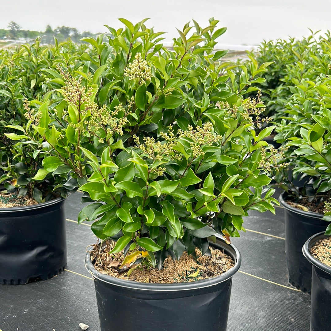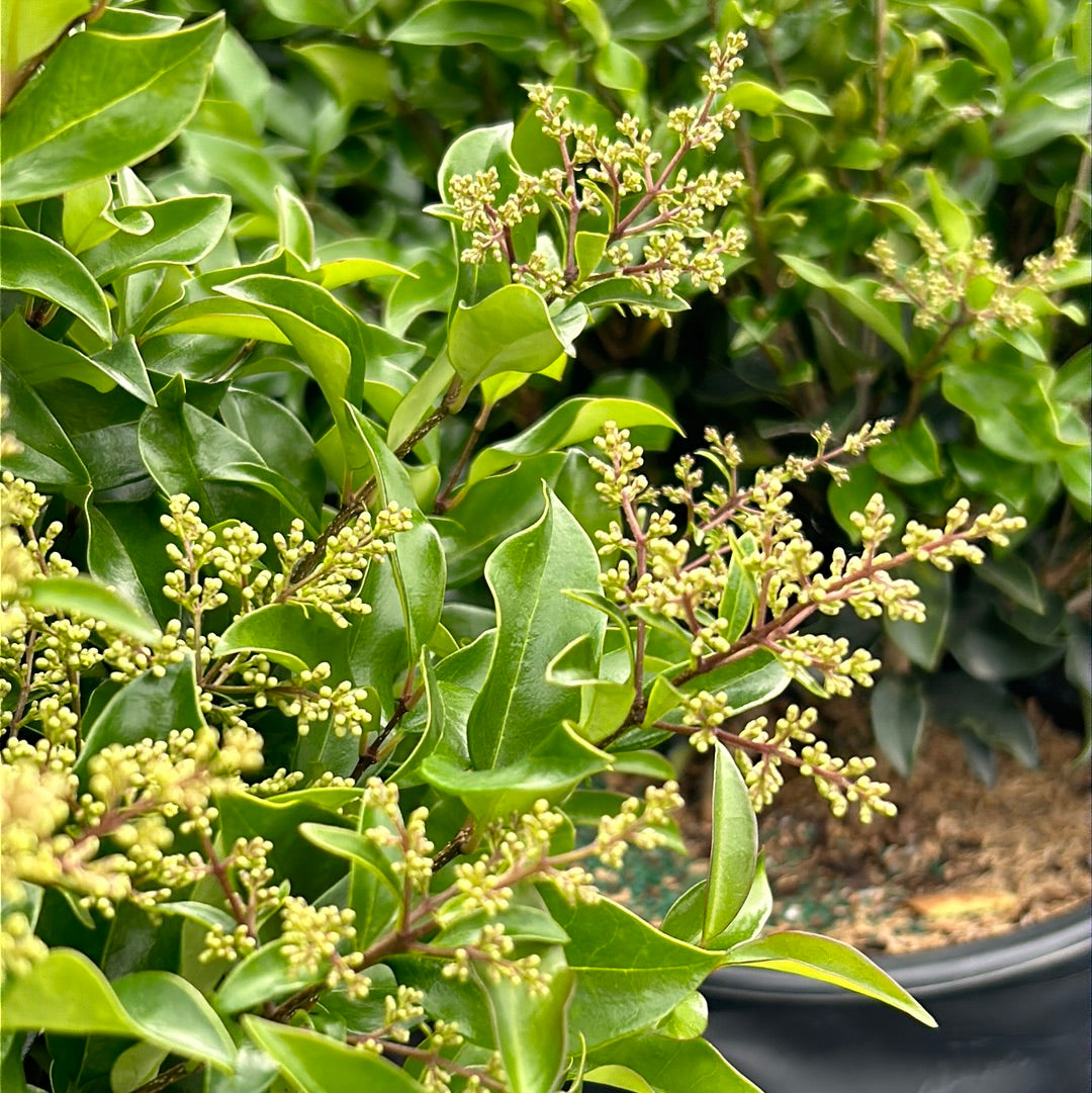 Recurve Ligustrum is a dense upright evergreen shrub with dark green foliage and tiny creamy-white fragrant flowers that bloom in spring.  Best color in full sun and rich well-drained soil.