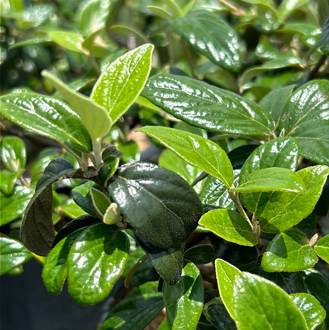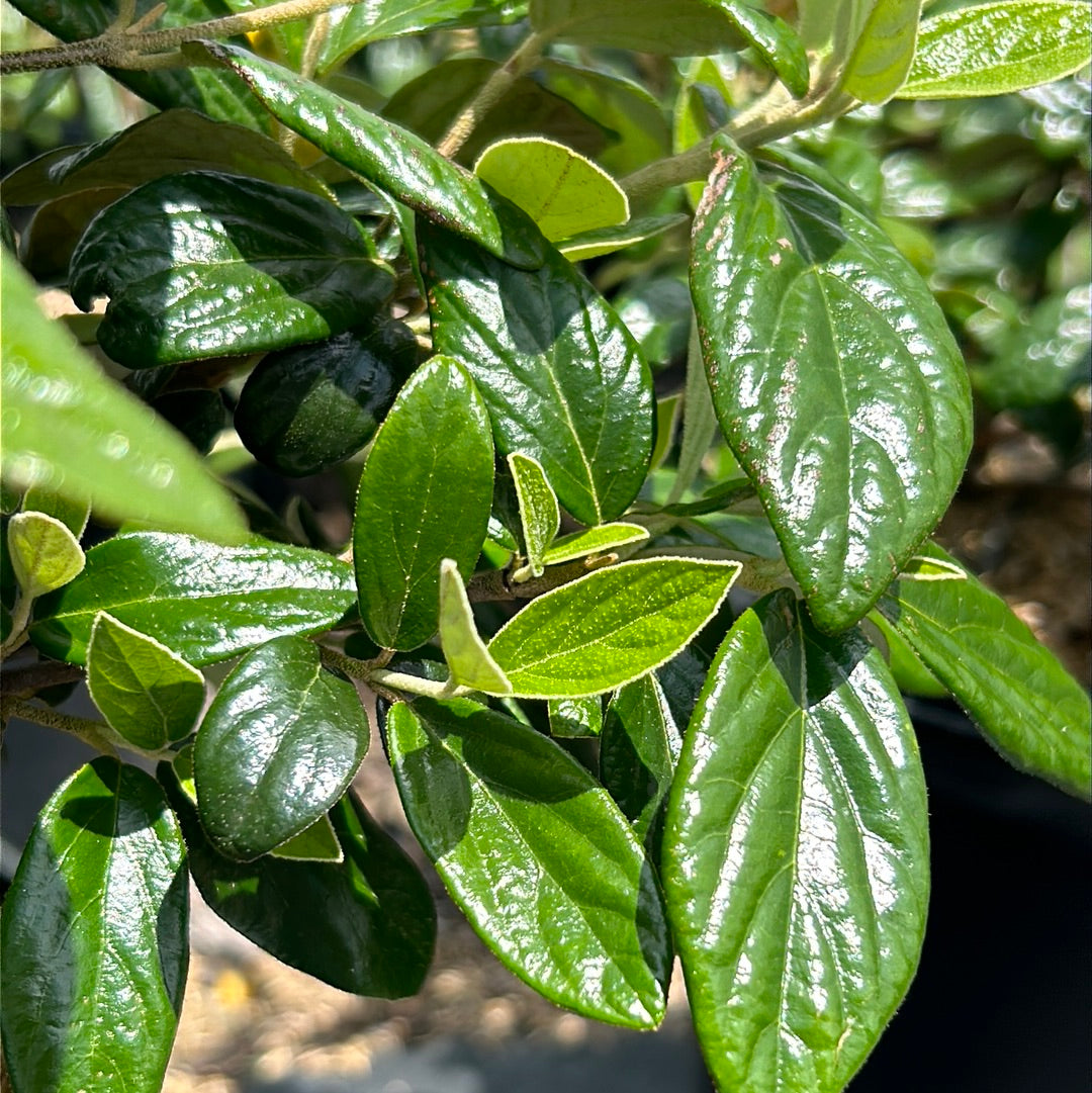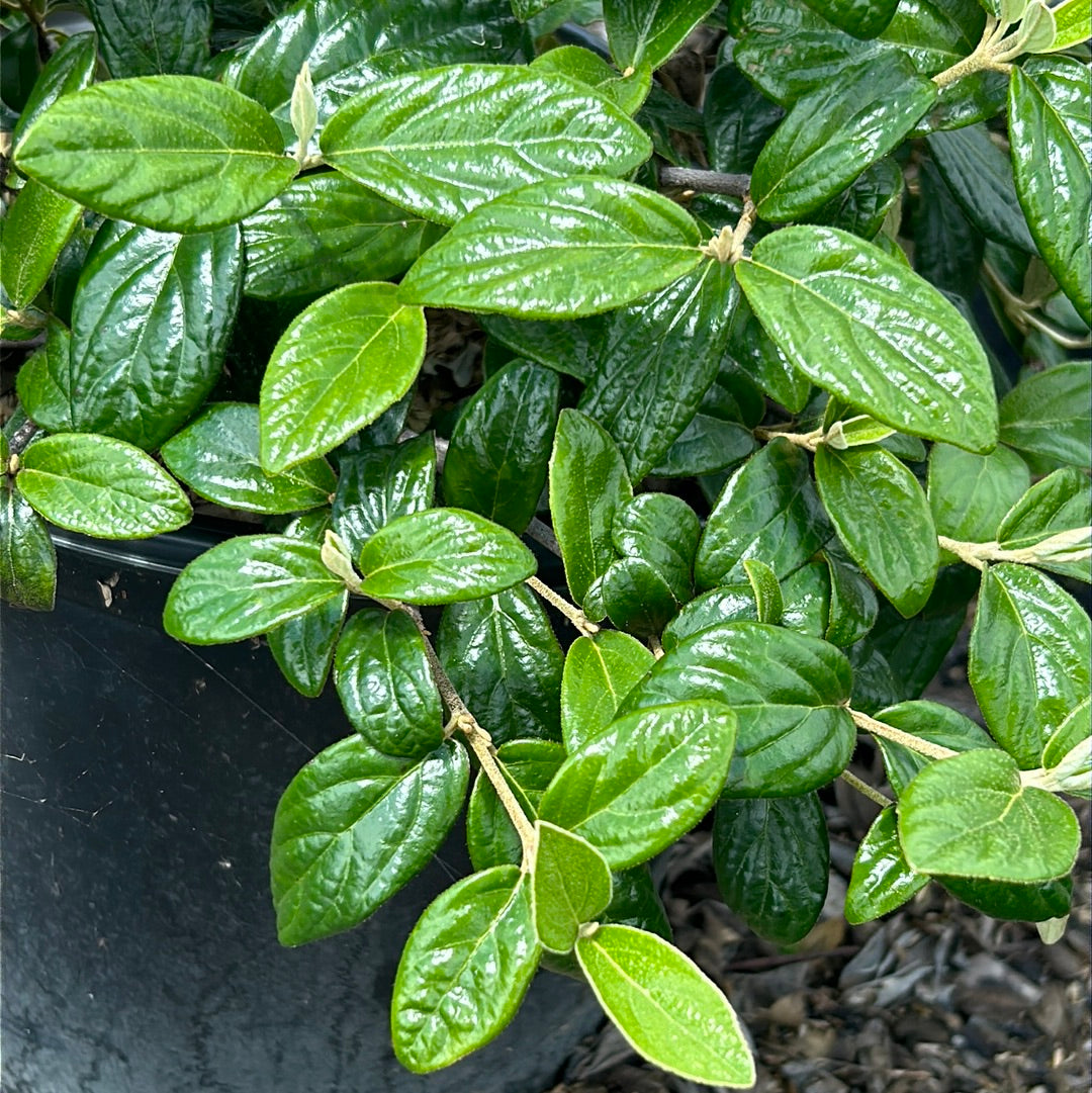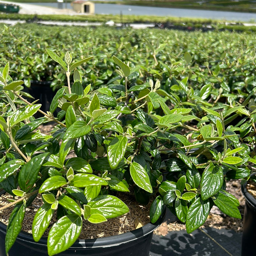 Conoy Burkwood Viburnum is a compact spreading multi-stemmed deciduous shrub with dense branching and glossy wrinkled dark green leaves that turn maroon in fall. Large flat clusters of creamy white flowers bloom in spring and give way to bright red berries that mature to black in fall. Flowers best with full sun and moist, lightly acidic well-drained soils. Drought tolerant once established. Foliage is evergreen in the South but will still earn fall color.