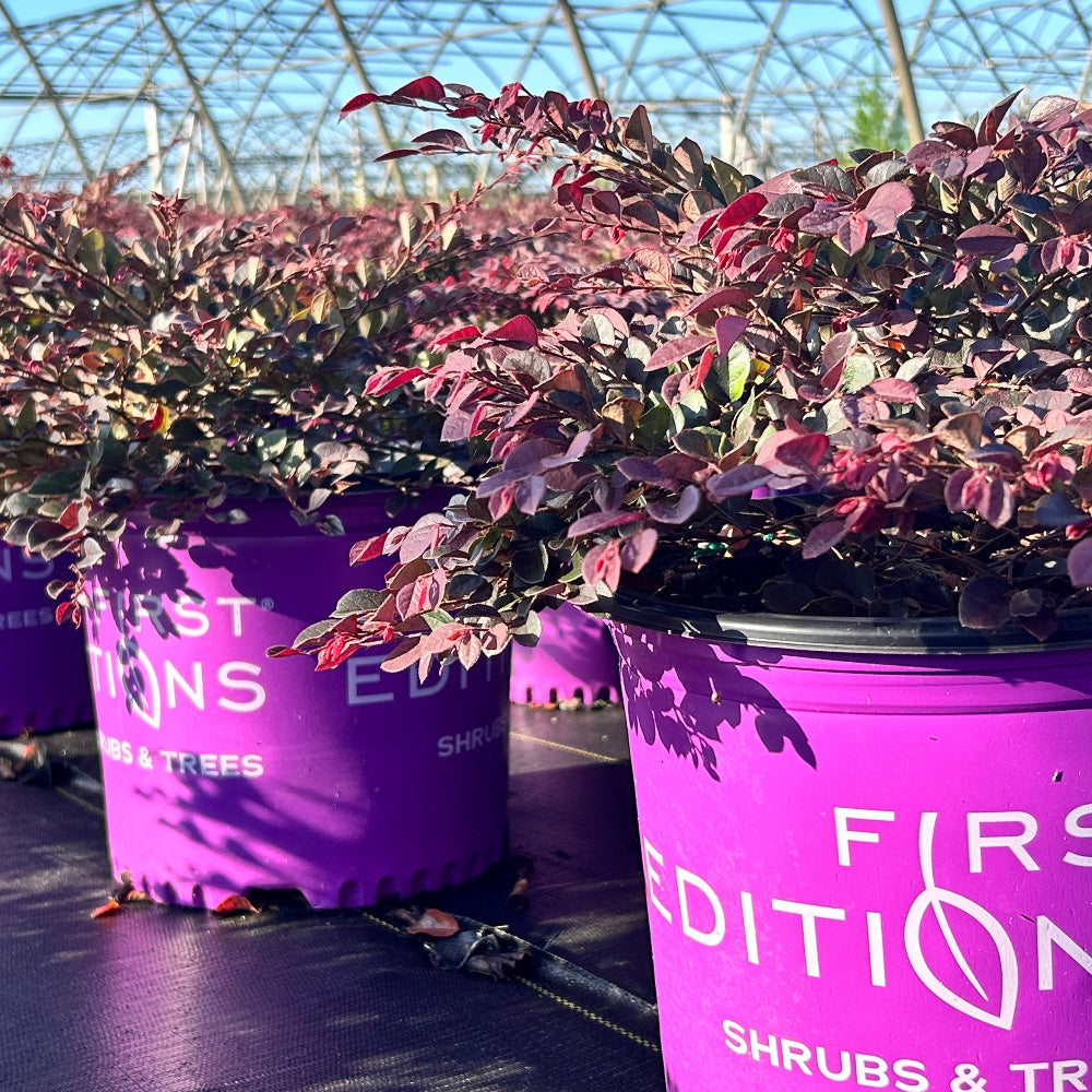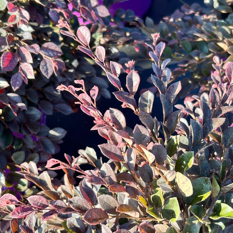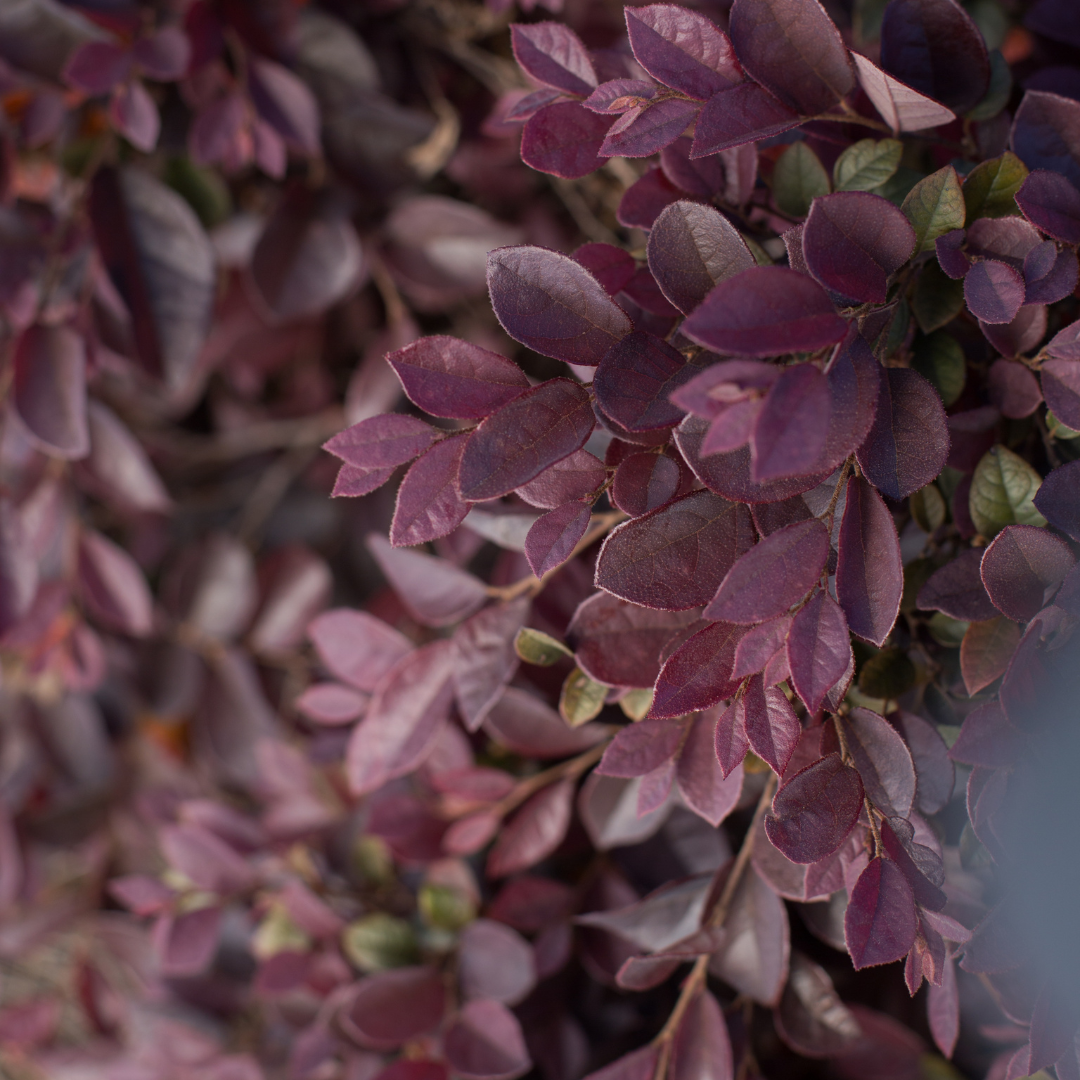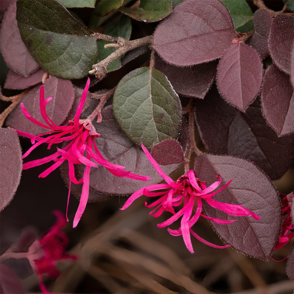 Crimson Fire Fringe Flower is a compact dwarf evergreen shrub with graceful arching branches with deep ruby foliage that fades to burgundy and heavy blooms of vibrant neon pink fringe-like flowers in late winter through spring. Best color in part sun and moist, acidic, well-drained soil.
