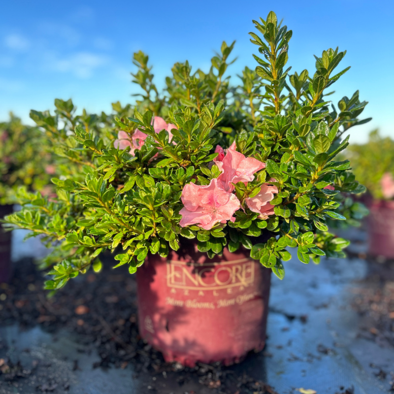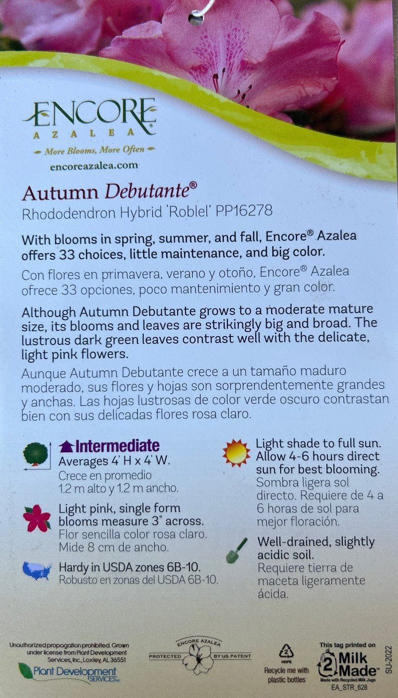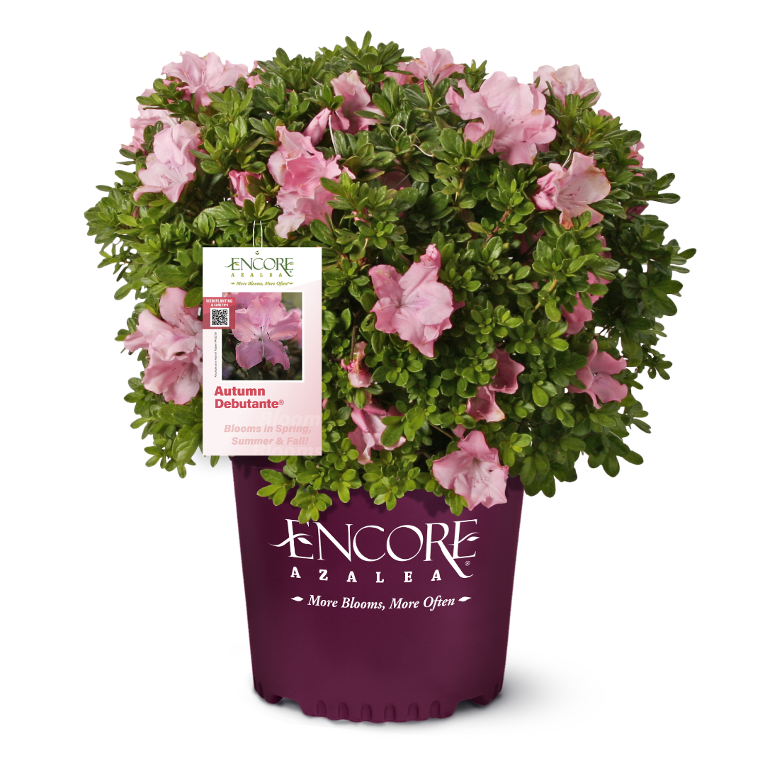 Azalea Encore® Autumn Debutante® is a compact, mid-sized evergreen azalea shrub with lush deep green foliage and large 3-inch soft pink flowers. Azalea Encore® Autumn Debutante® blooms in mid-spring and continues to rebloom into fall, providing long-lasting seasonal color. This versatile azalea performs best in partial sun and thrives in acidic, rich, well-drained soils. Azaleas are excellent pollinator and butterfly attractors, making Azalea Encore® Autumn Debutante® a beautiful choice for foundation plantings, woodland gardens, and mixed shrub beds.