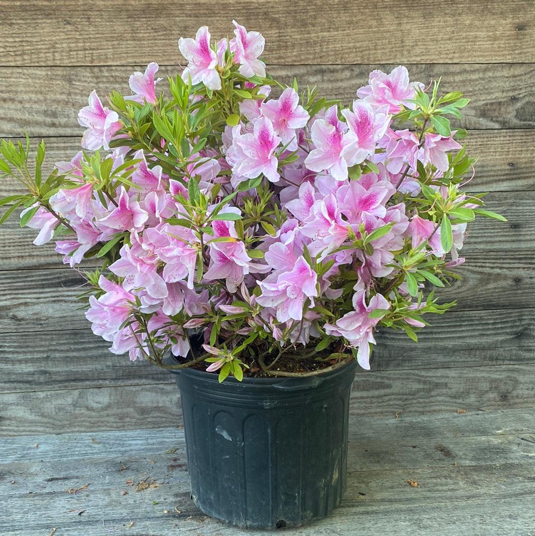 Azalea George Tabor is a larger, dense reblooming evergreen shrub that responds well to pruning for size management. Azalea George Tabor has light green foliage and produces an early heavy bloom of pale white-pink flowers with darker pink throats throughout spring, followed by a smaller repeat bloom in fall. This versatile azalea performs best in partial sun and thrives in acidic, rich, well-drained soils. Azaleas are excellent pollinator and butterfly attractors, making Azalea George Tabor a beautiful choice for foundation plantings, woodland gardens, and mixed shrub beds.