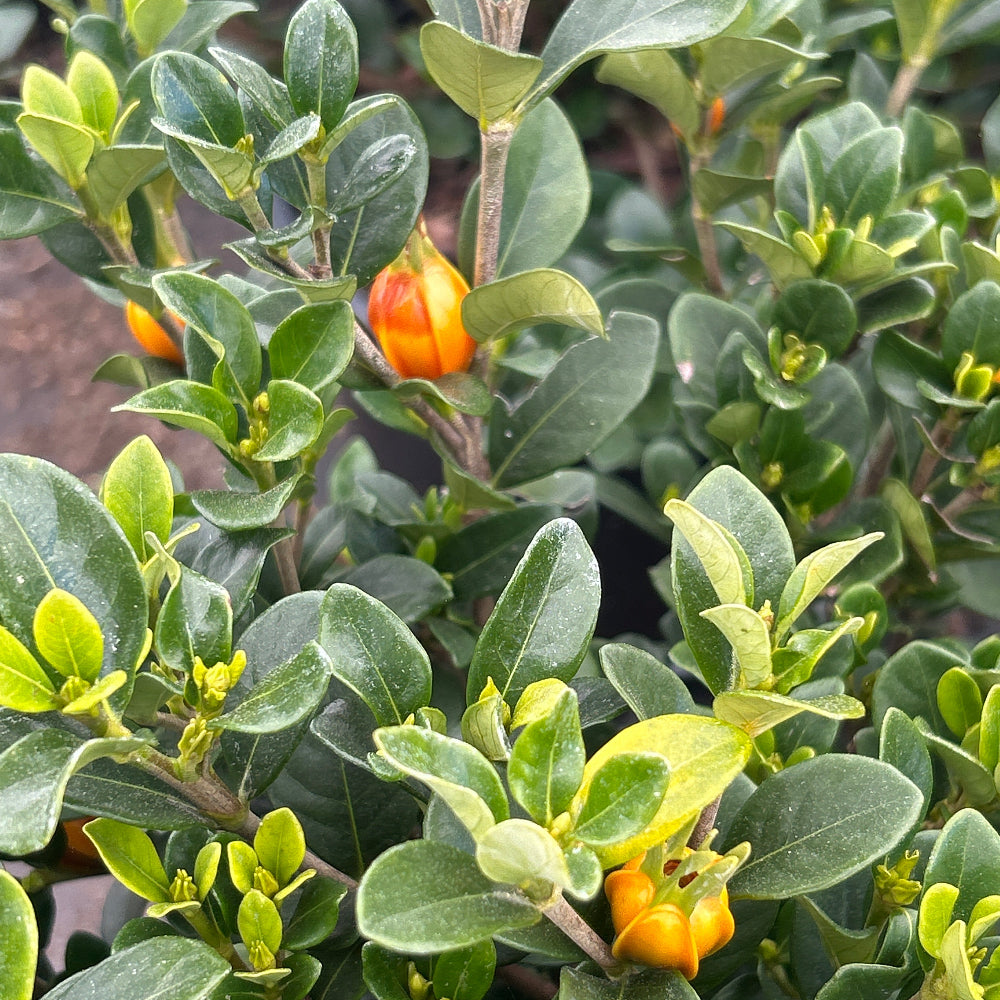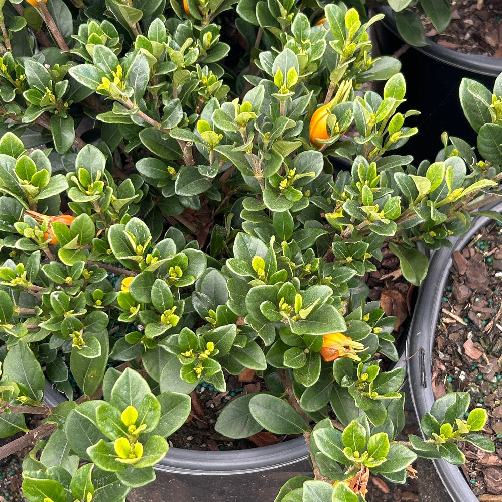 Kleim’s Hardy Gardenia is a hardy dwarf evergreen shrub noted for its thick, glossy dark green leaves and extremely fragrant star-like white flowers. These flowers either bloom throughout the year if the temperature doesn’t dip below 60 degrees F or in late spring to early summer.  Prefers partial sun and moist, well-drained acidic soils.  One of the few varieties able to tolerate direct sunlight if protected from reflected light from hardscapes, and flower buds resist frost damage.