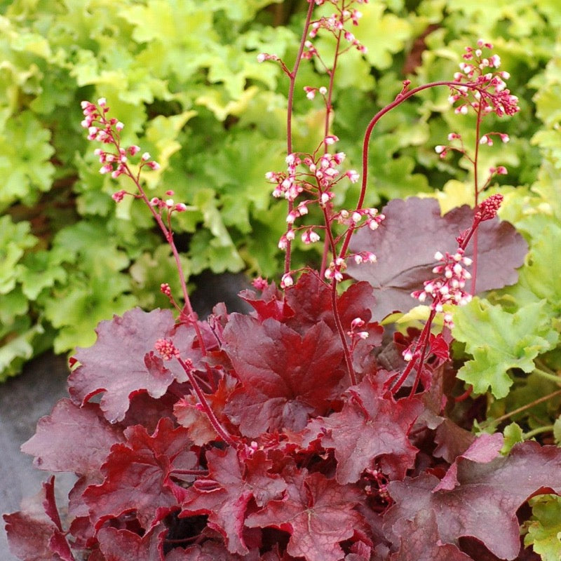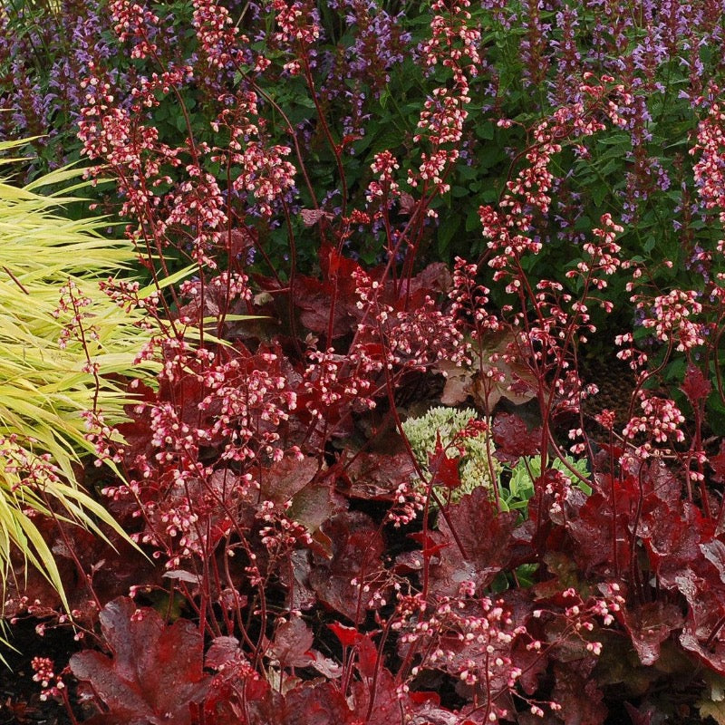 Fire Chief Coral Bells is an evergreen herbaceous perennial with a mounding habit grown for its vivid basal foliage. The lobed leaves emerges a brilliant wine red and earns maroon markings as it matures before darkening with brown hues in fall. Airy clusters of white and pink bell-like flowers bloom on dark red spires in late spring with some reblooms in summer and fall attracting butterflies. Best bloom in partial sun and moist well-drained soils.