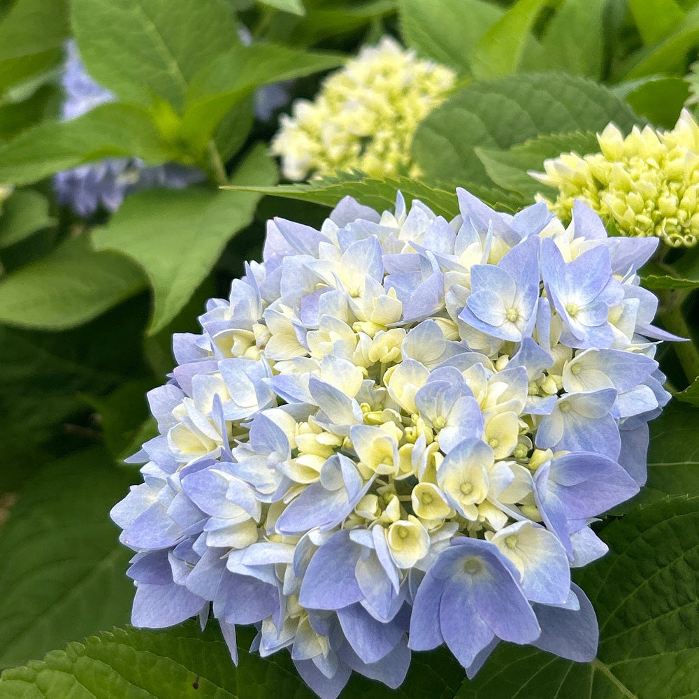 Big Daddy Hydrangea is a compact deciduous shrub that blooms on both old and new wood. Its serrated. glossy dark green leaves turn yellow in fall. The color of the large rounded panicles of mophead flowers depends on the soil PH - a mild pink in alkaline soils, while acidic soils produce blue flowers. The flowers open green to white and gain its color through summer attracting pollinators. Best bloom in partial sun and rich, moist well-drained soils.