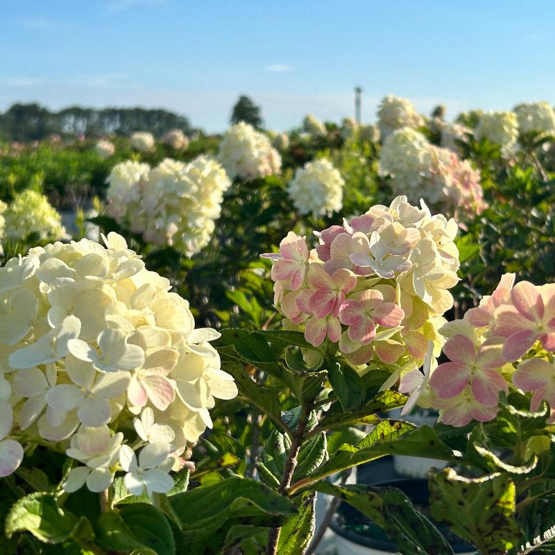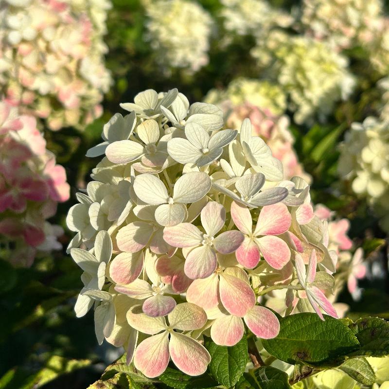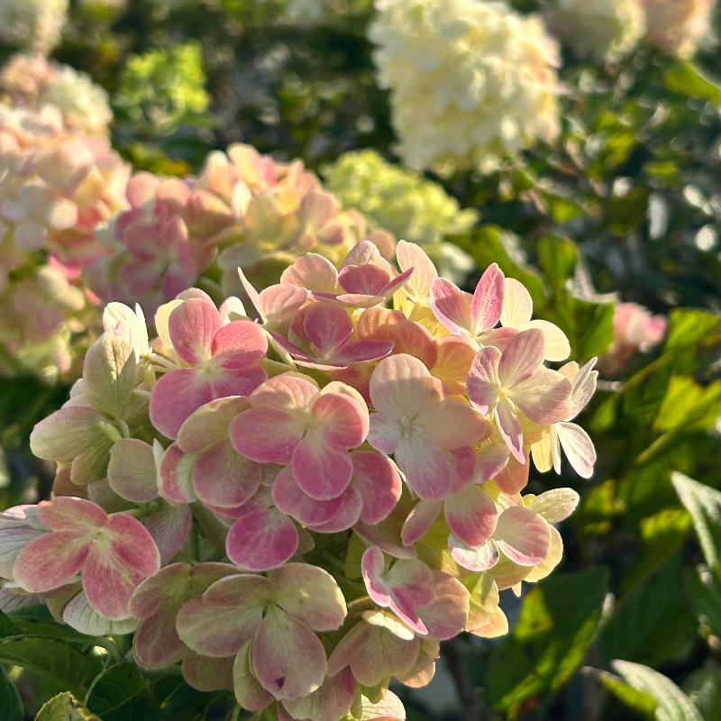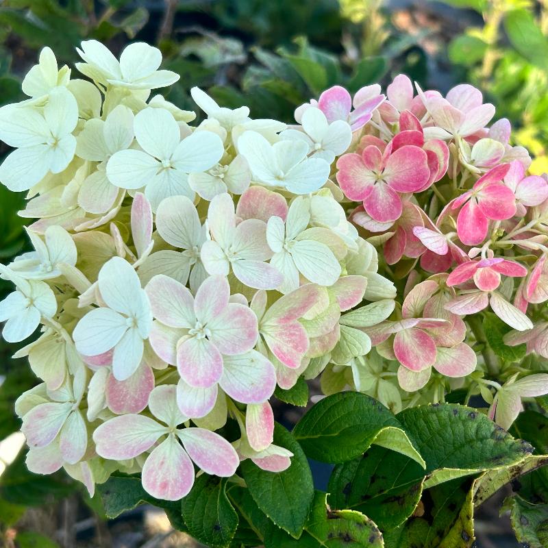 Little Lime Punch Hydrangea is an upright reblooming deciduous shrub with a mounding habit and dense blooms. The short conical panicles open lime green and mature through a show of white, pink, and rich red all throughout summer, attracting butterflies. While can tolerate full sun, its best blooms are in part sun and rich, moist well-drained acidic soils.