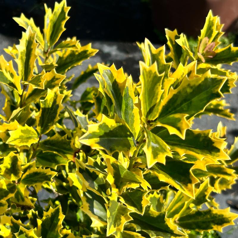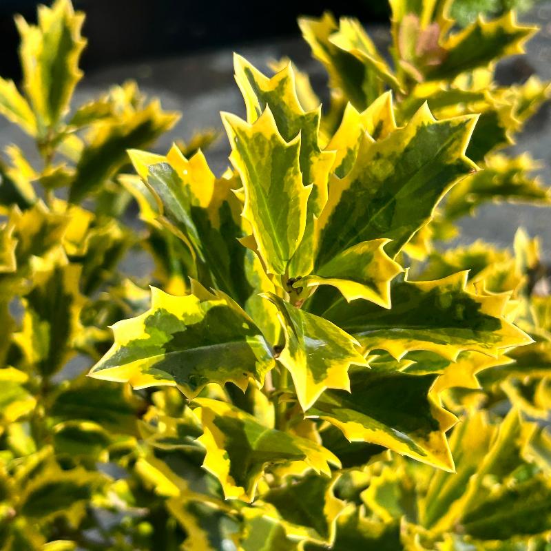 Ilex Golden Oakland® (Holly) is a large, dense evergreen shrub known for its stiff upright pyramidal habit and bold architectural presence in the landscape. The distinctive oak-shaped, spiny foliage of Ilex Golden Oakland® emerges a rich golden color before gradually developing green centers, creating a striking variegated effect that lasts through much of the growing season. As the leaves mature, Ilex Golden Oakland® transitions to deeper green tones while maintaining strong texture and year-round structure. Lightly fragrant spring flowers may develop into ornamental berries when properly pollinated, adding additional seasonal interest. Ideal for hedges, privacy screens, and specimen plantings, Ilex Golden Oakland® thrives in moist, slightly acidic, well-drained soils. Gardeners appreciate Ilex Golden Oakland® for its bold foliage color, strong growth habit, and reliable evergreen performance in both formal and natural landscape designs.